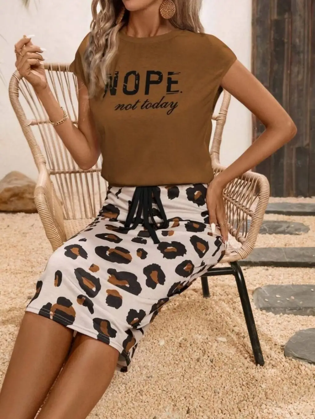Kadın Bisiklet Yaka Kısa Kol Leopar Desen Bluz Ve Pantolon Ikili Takım