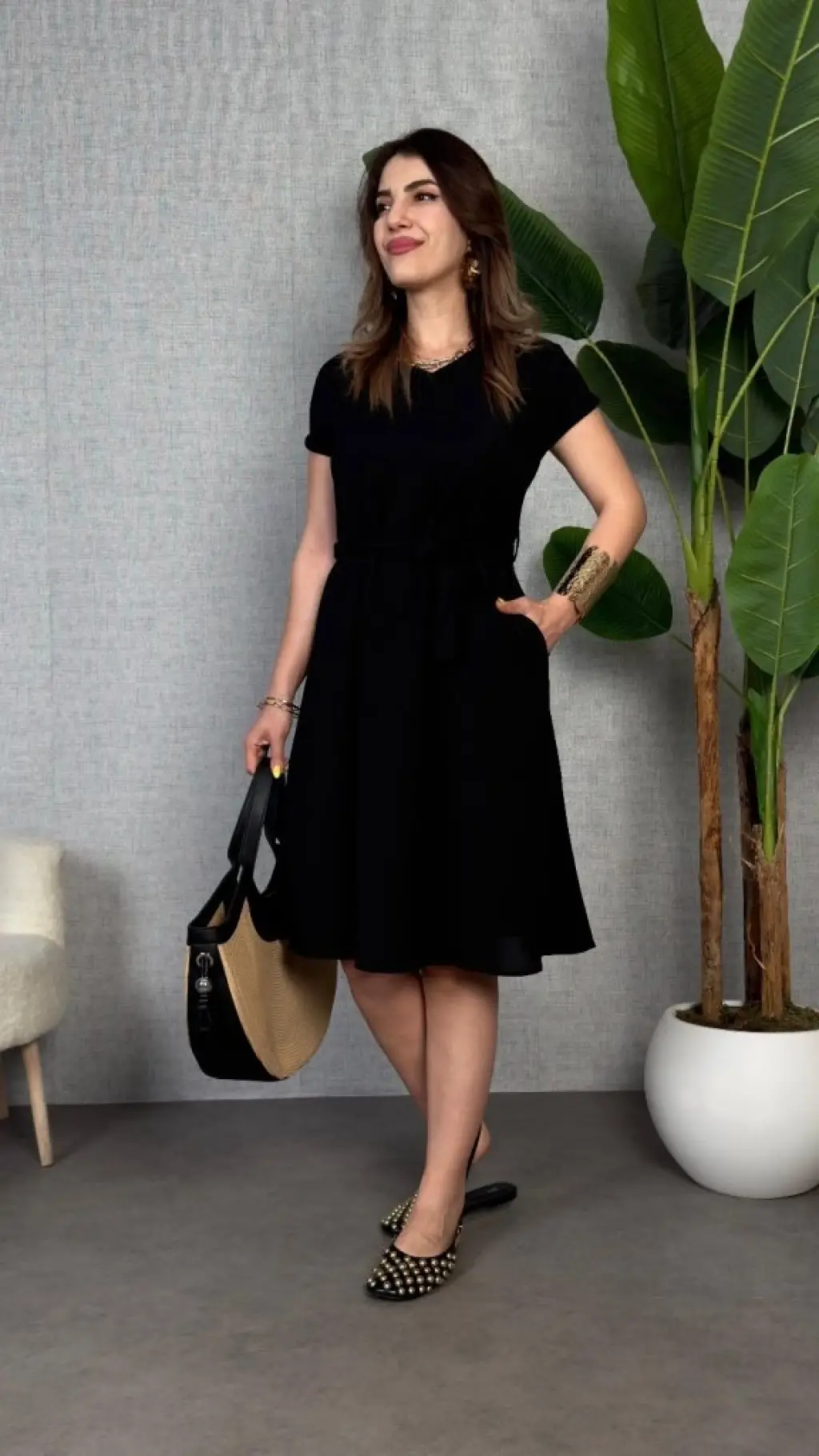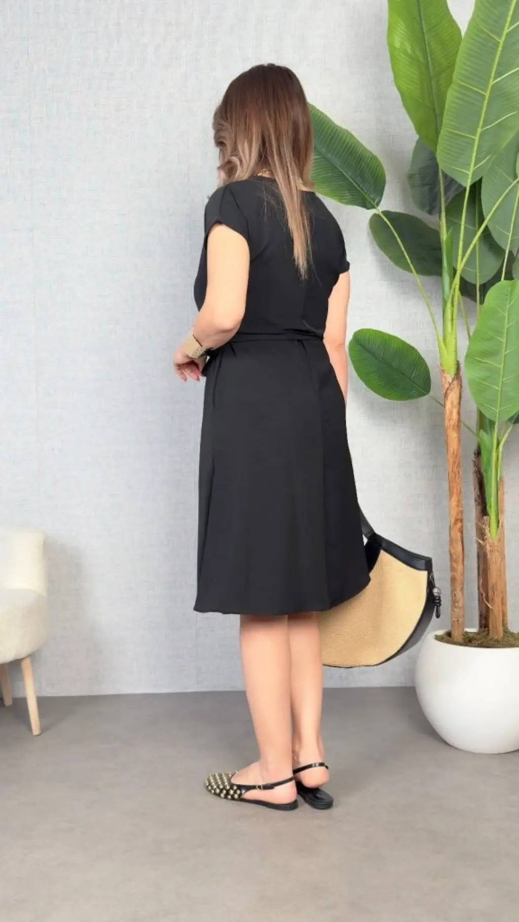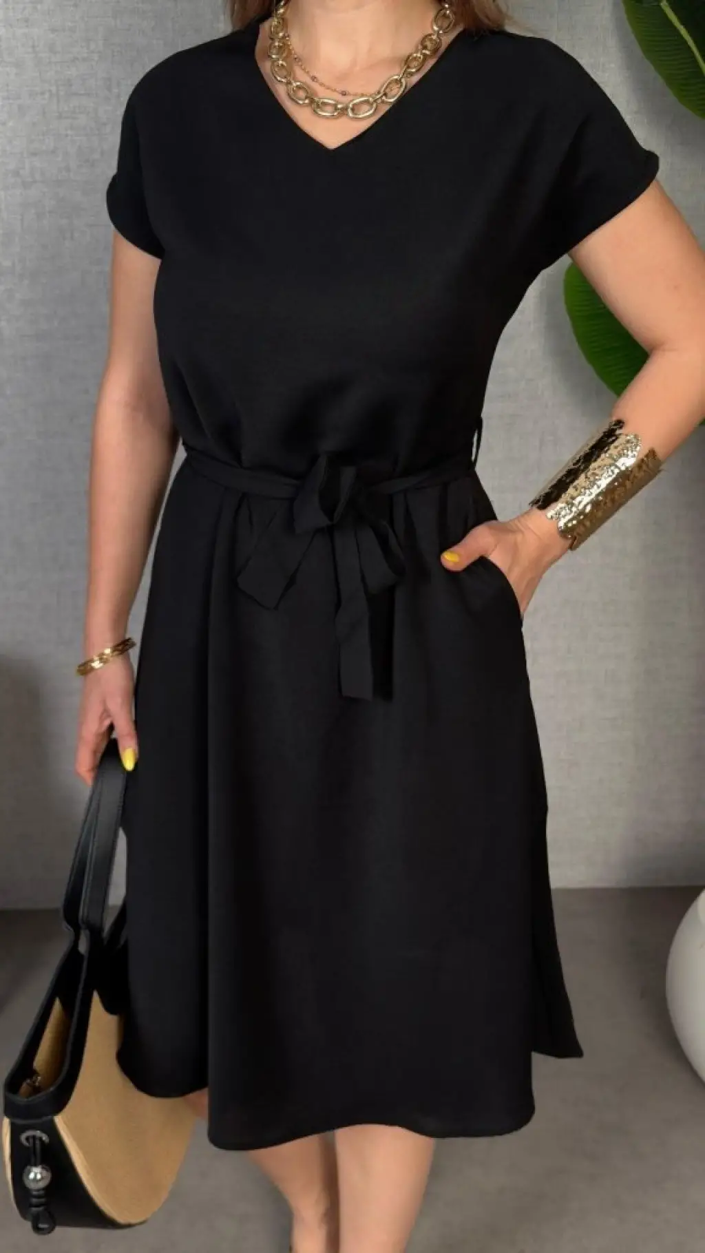 Kadın Kısa Kollu V Yakalı Beli Kuşaklı Ithal Keten Elbise