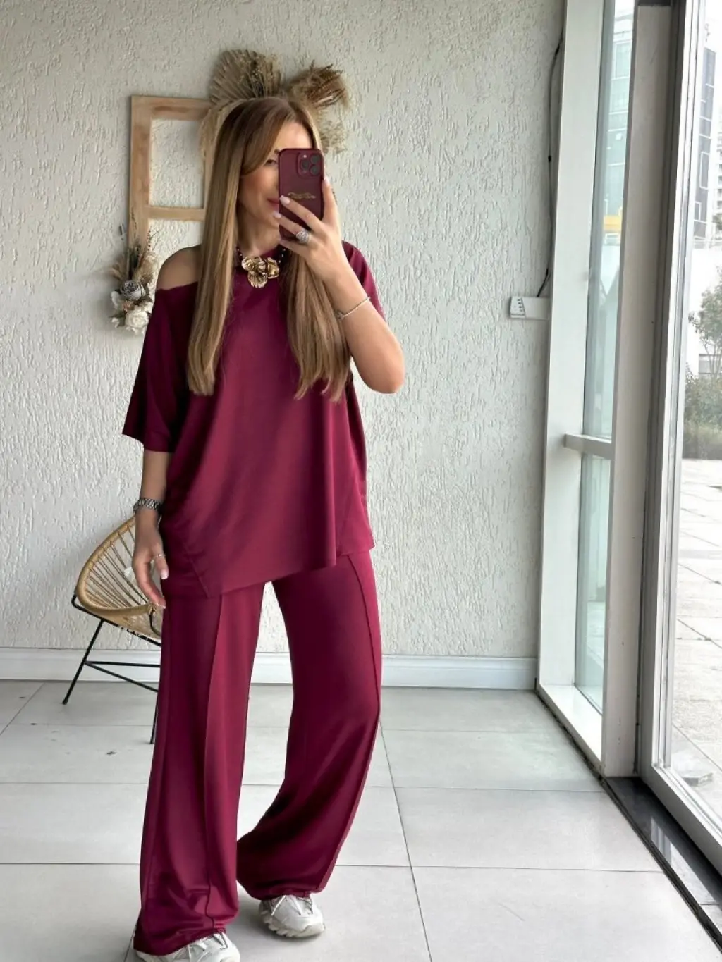 Kadın Tek Omuzdan Açık Geniş Kesim Viskon Iki Iplik Bluz Ve Pantolon Ikili Takım