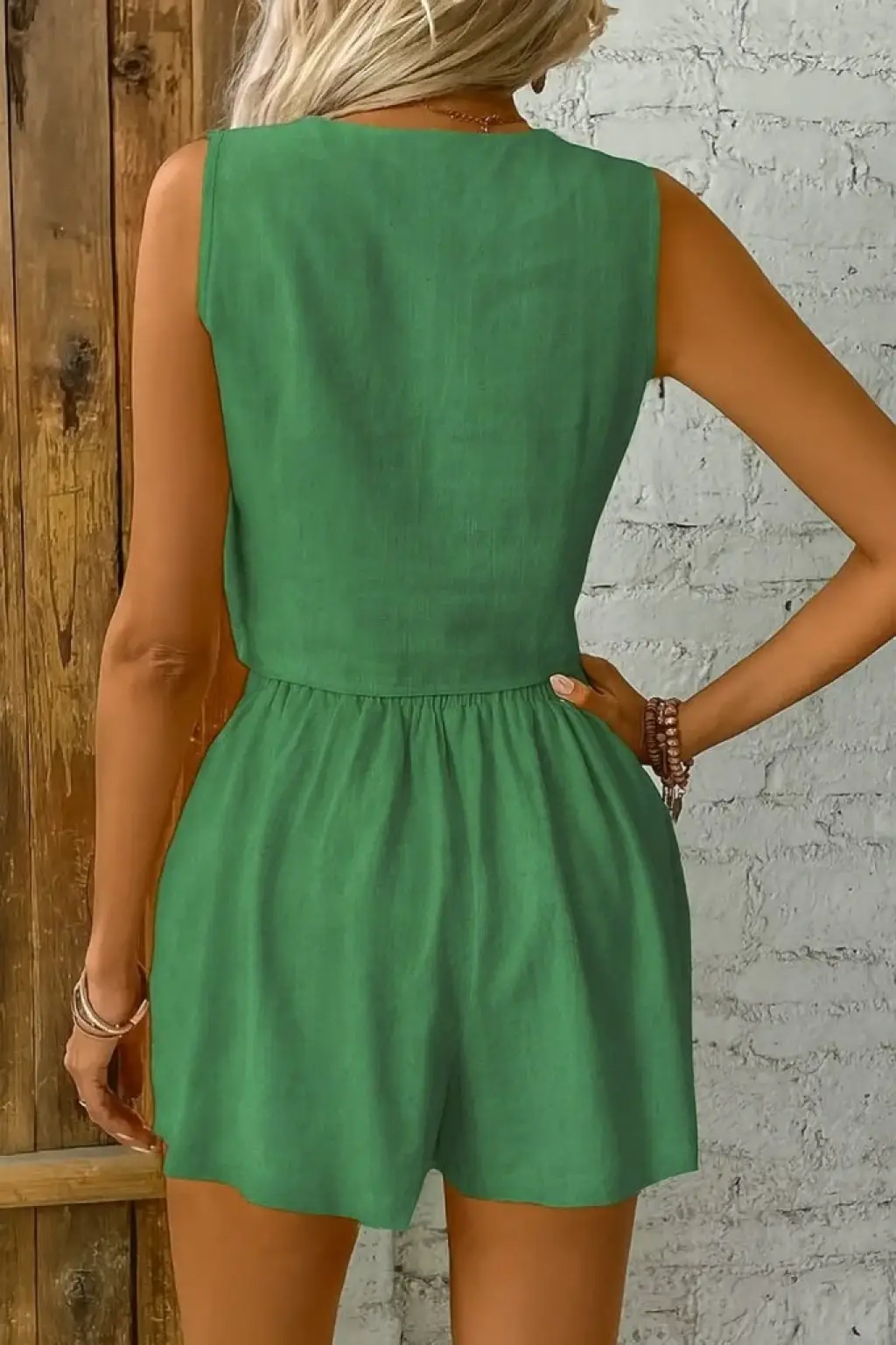 Kadın Kolsuz Askılı V Yakalı önden Düğmeli Ithal Keten Ceket Ve Short Ikili Takım