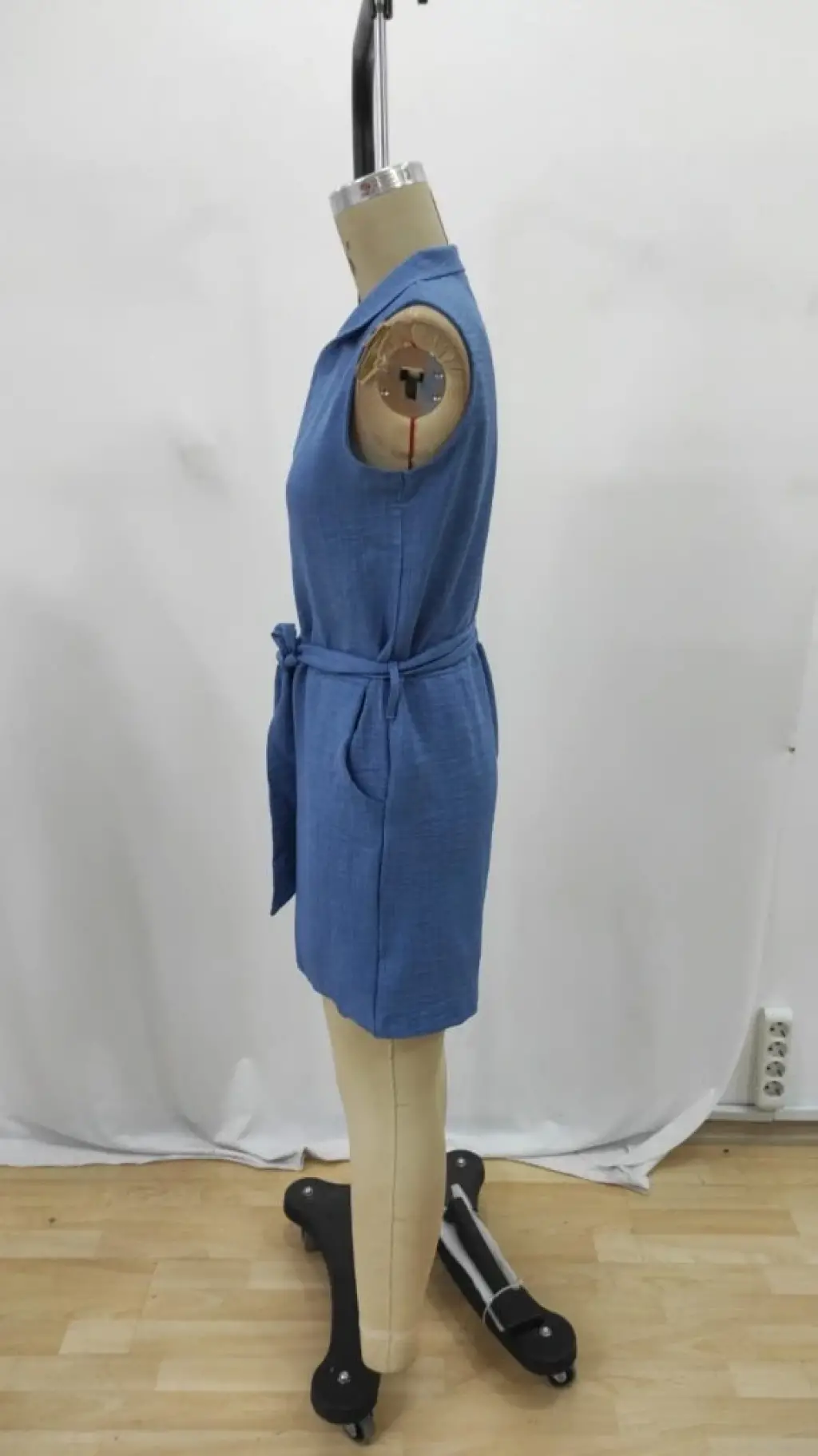 Kadın Sıfır Kollu Yakalı Düğmeli Belden Kuşaklı Kısa Keten Tulum