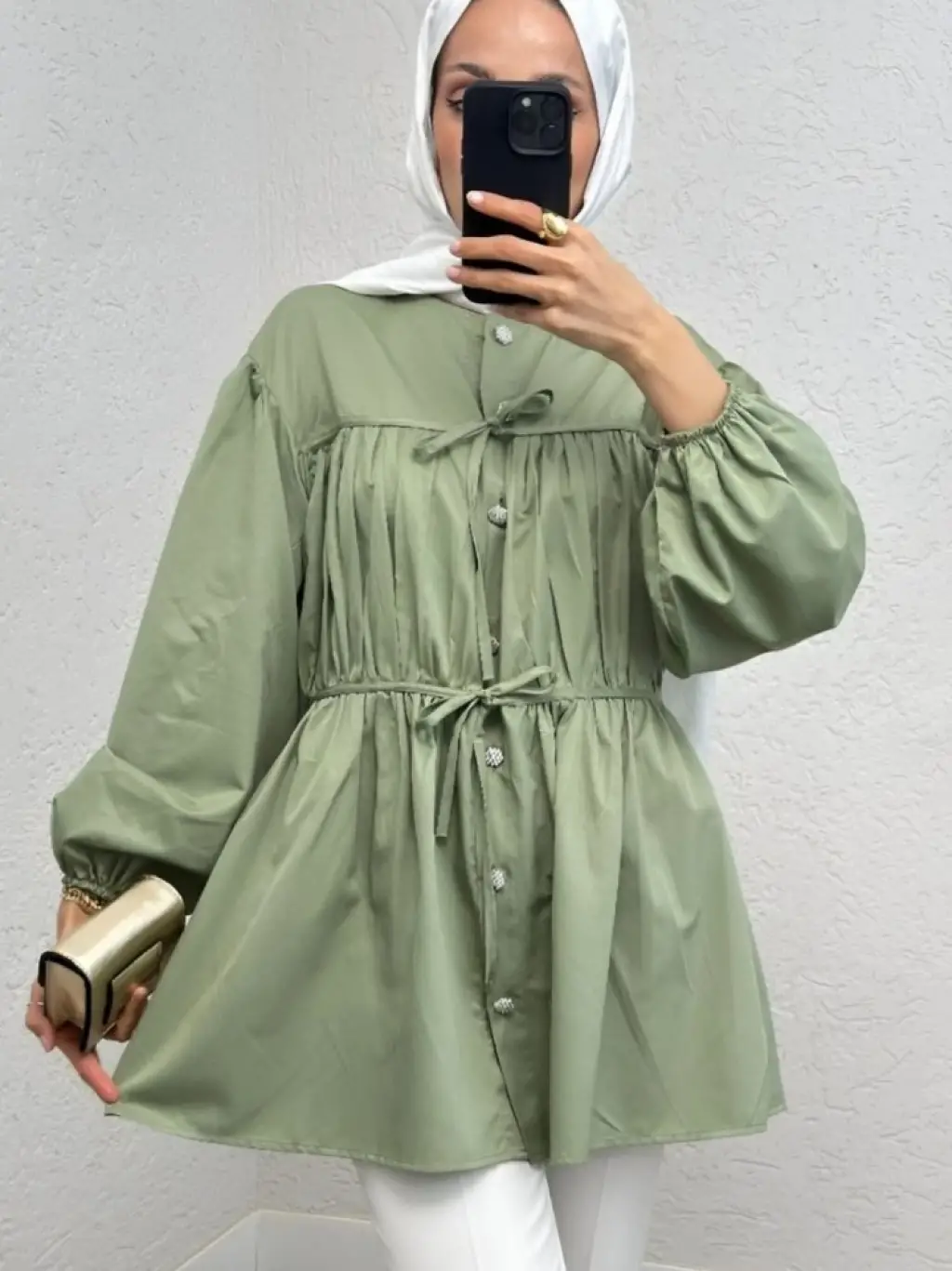 Taşlı Düğmeli Kolu Lastikli Bağlama Detaylı Gömlek -Su Yeşili