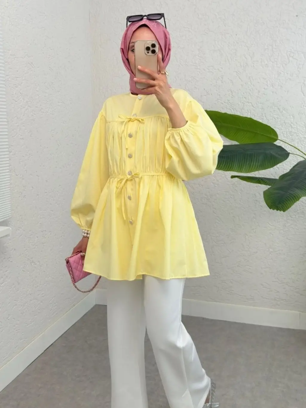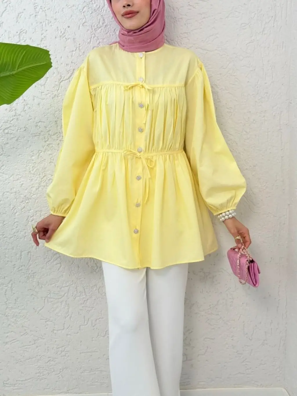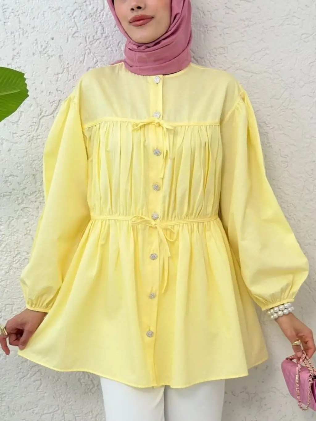 Taşlı Düğmeli Kolu Lastikli Bağlama Detaylı Gömlek -Sarı