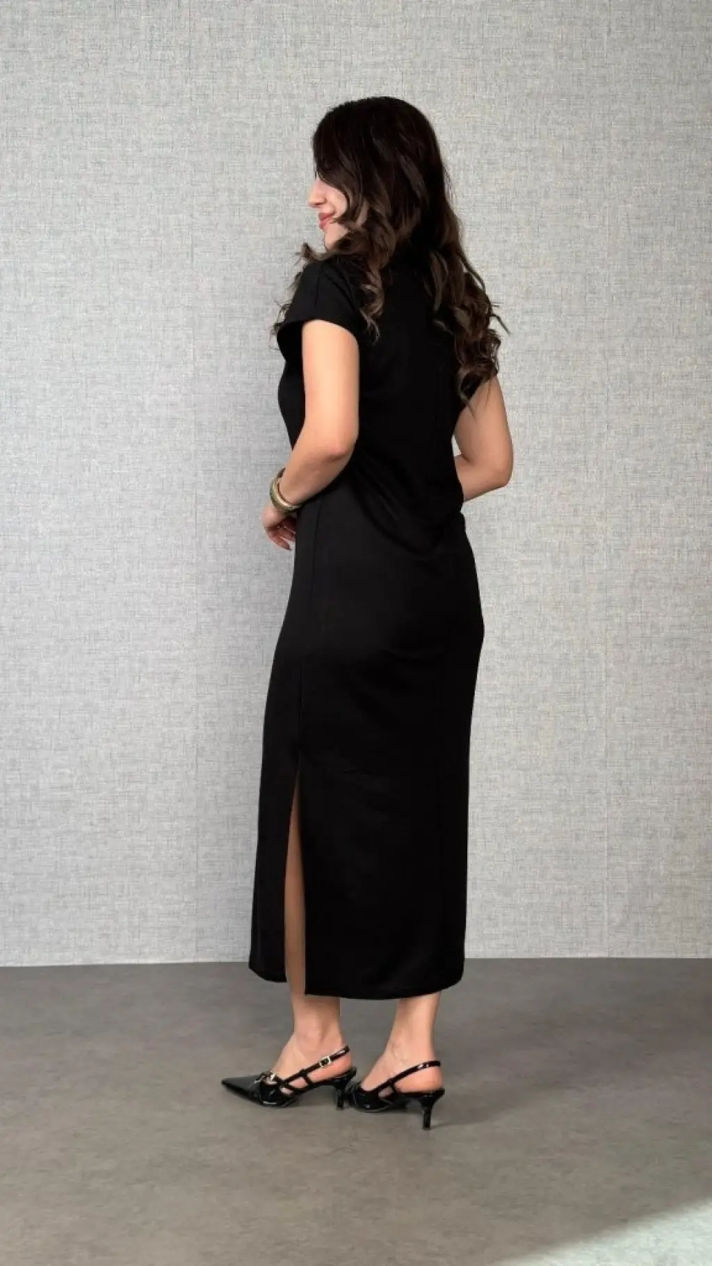 Kadın Truvakar Kollu Bisiklet Yaka Kemersiz Yırtmaç Detaylı Uzun Ithal Krep Elbise