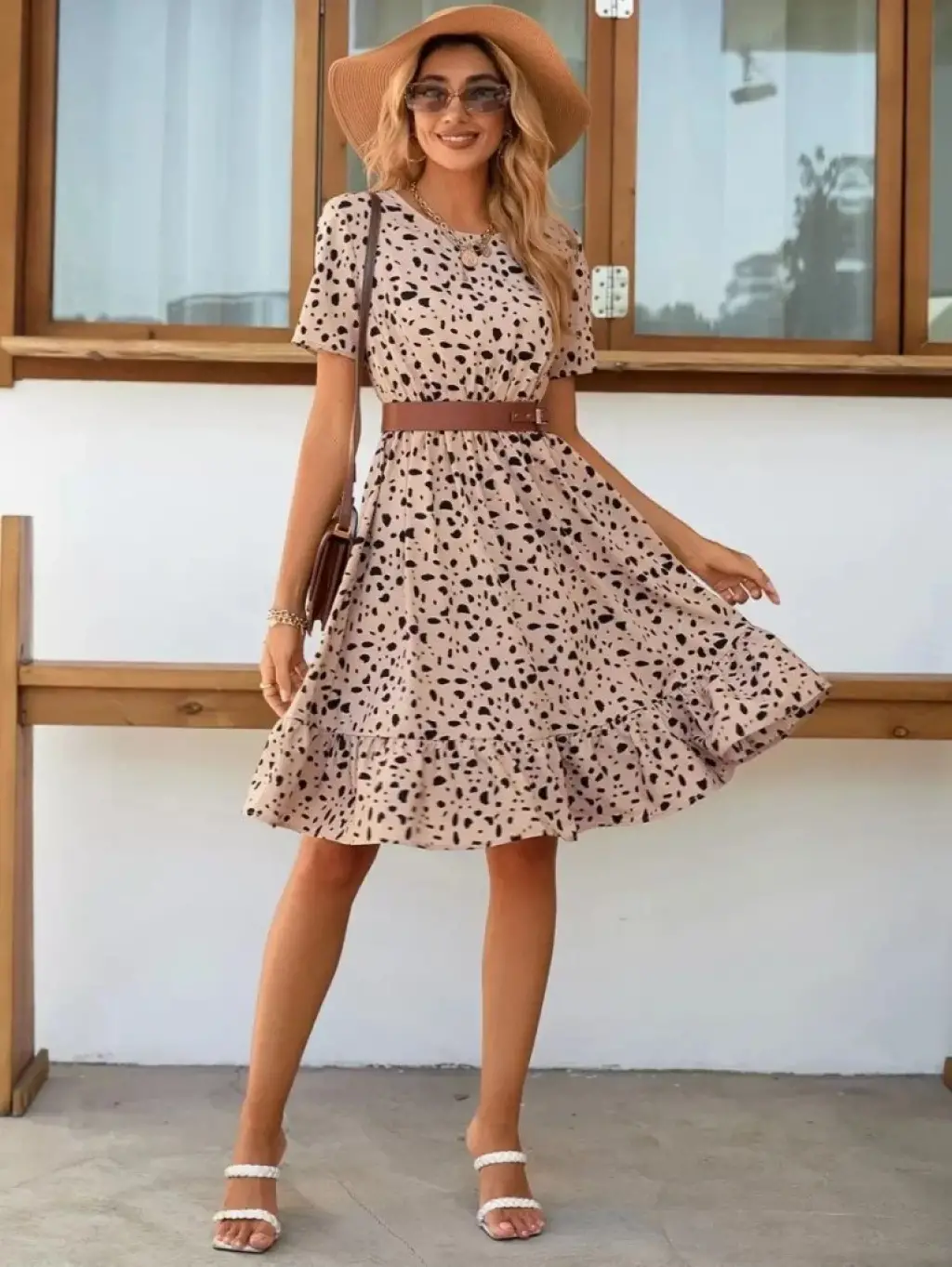 Kadın Kısa Kollu Bisiklet Yaka Desenli Süprem Elbise