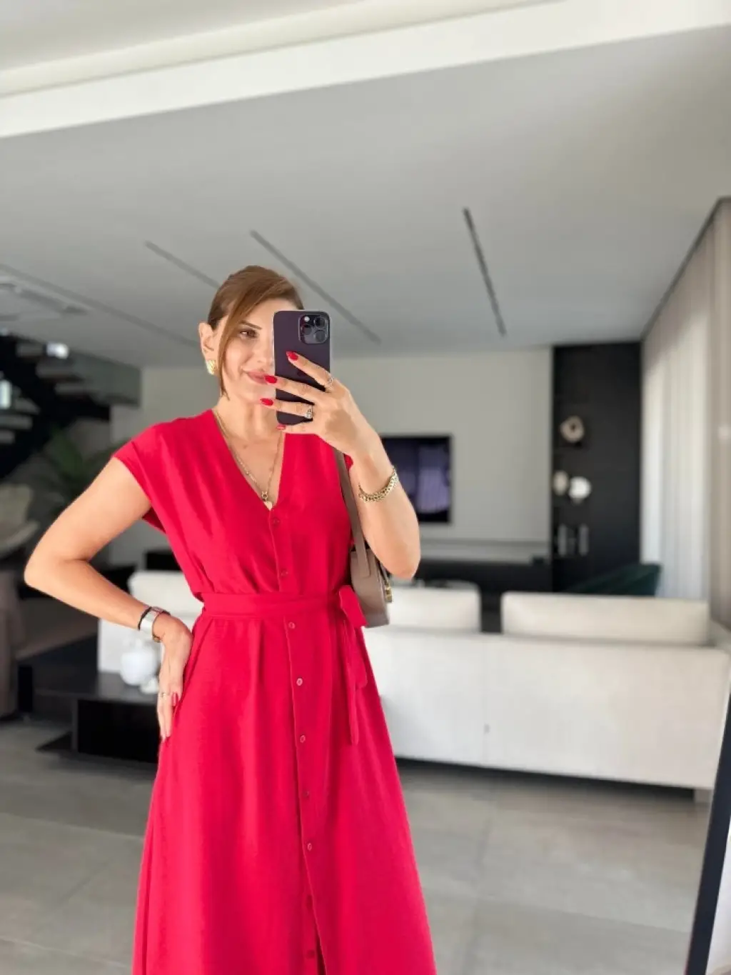 Kadınn V Yaka Düğme Detay Kuşak Dahil Elbise