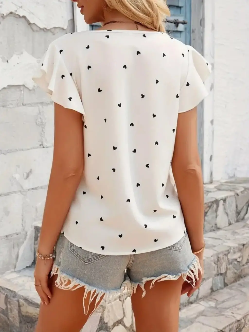 Kadın Kısa Kelebek Kollu Bisiklet Yaka Kalp Desenli Süprem Bluz