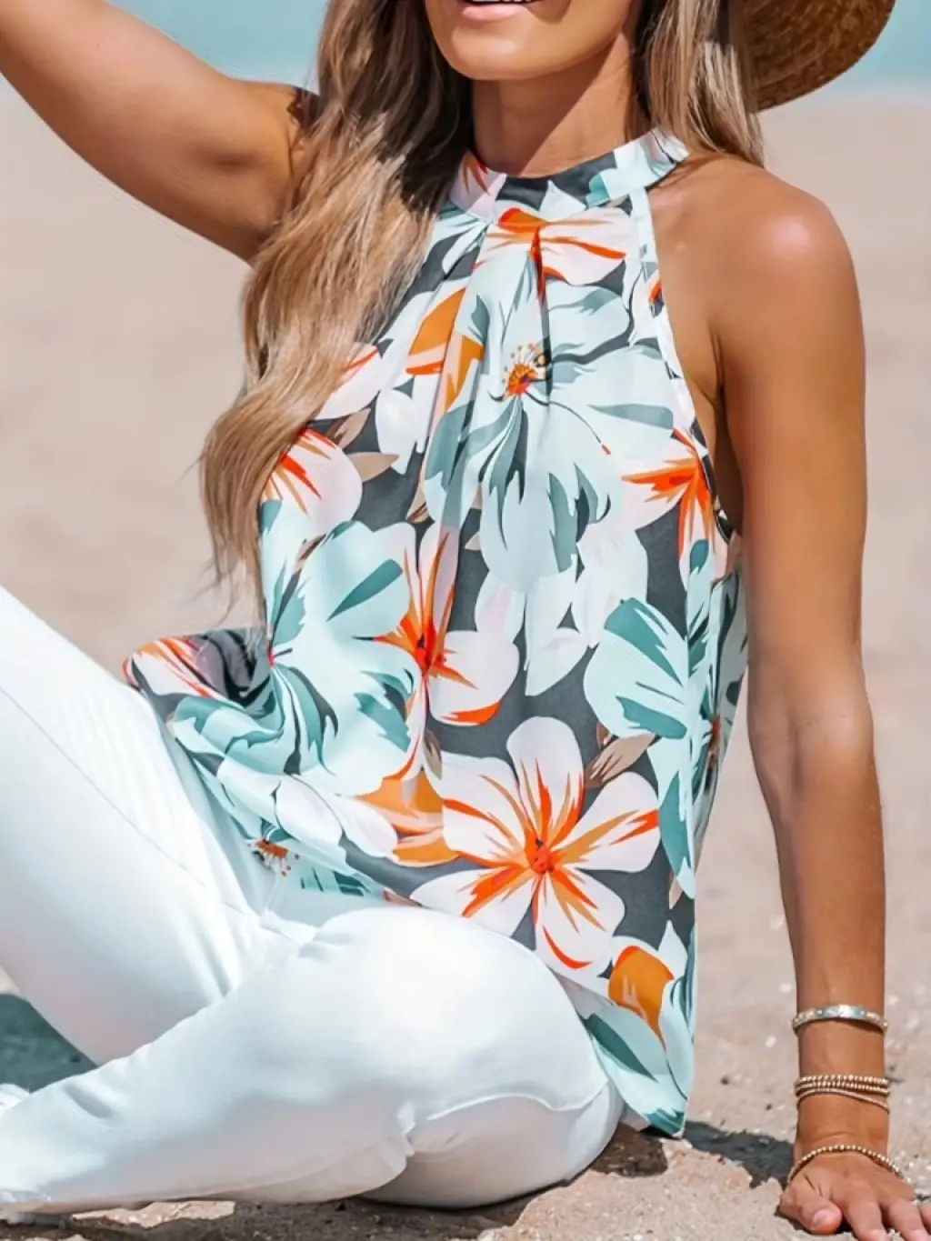 Kadın Kolsuz Halter Yaka Desenli Bluz