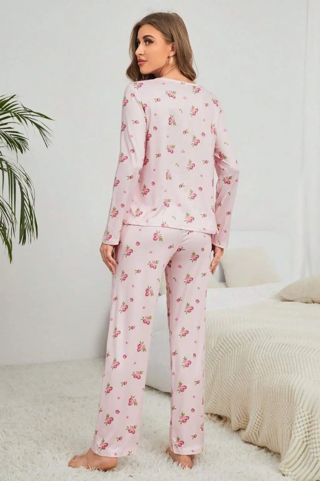 Pembe Çiçek Desenli Bisiklet Yaka Pijama Takımı 7131