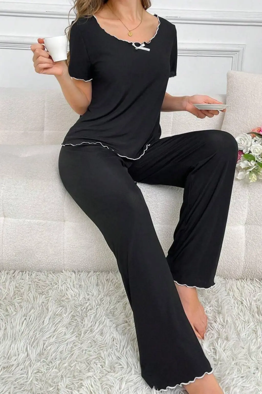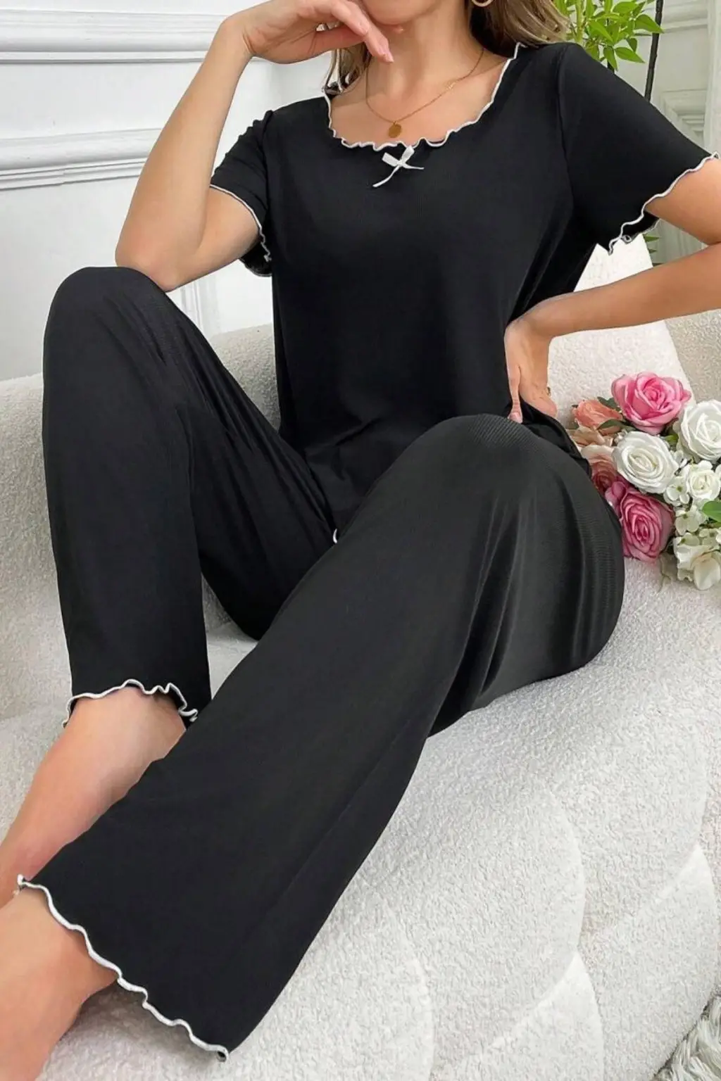 Siyah Bisiklet Yaka Pamuklu Yazlık Pijama Takımı 7343
