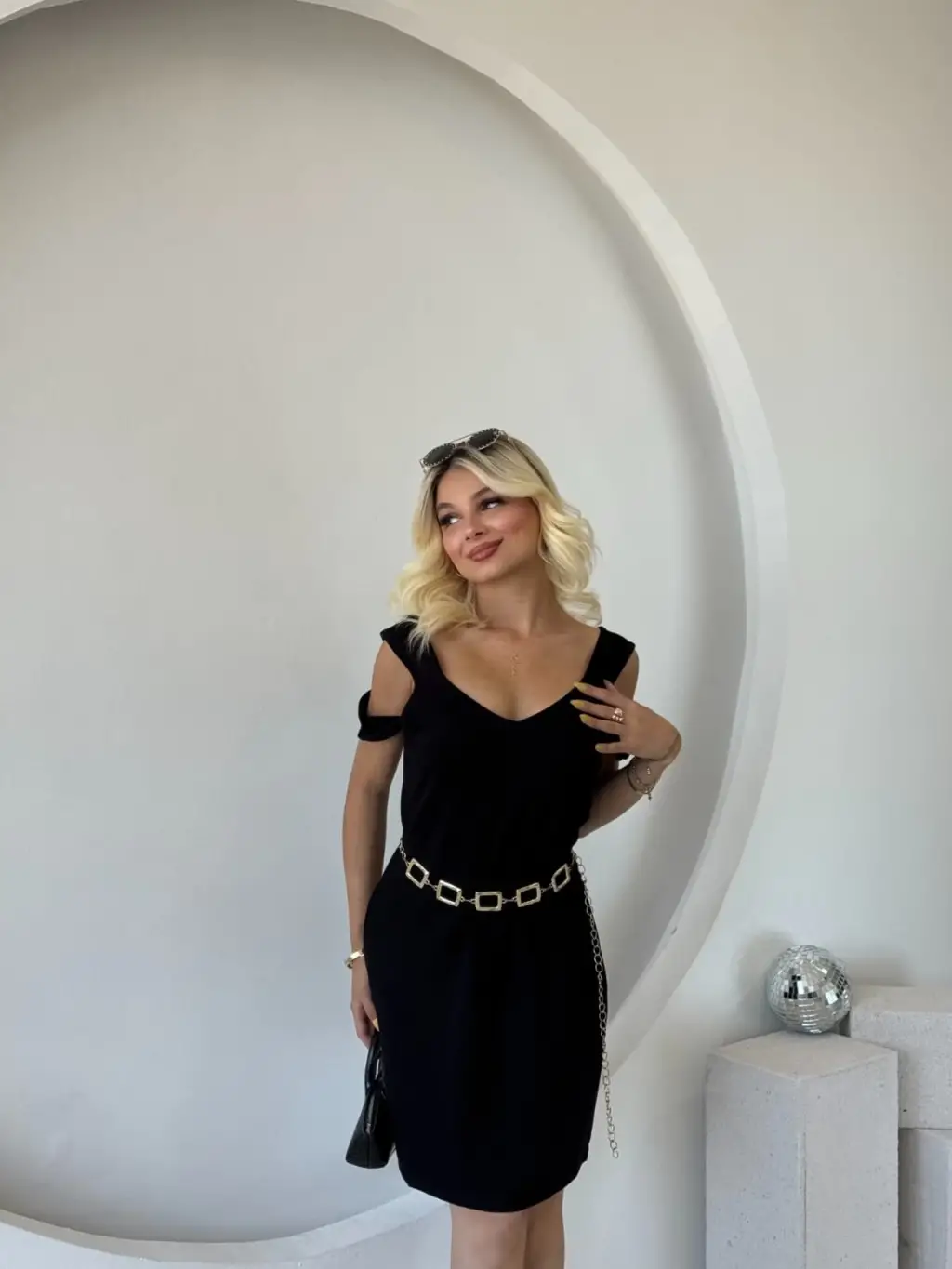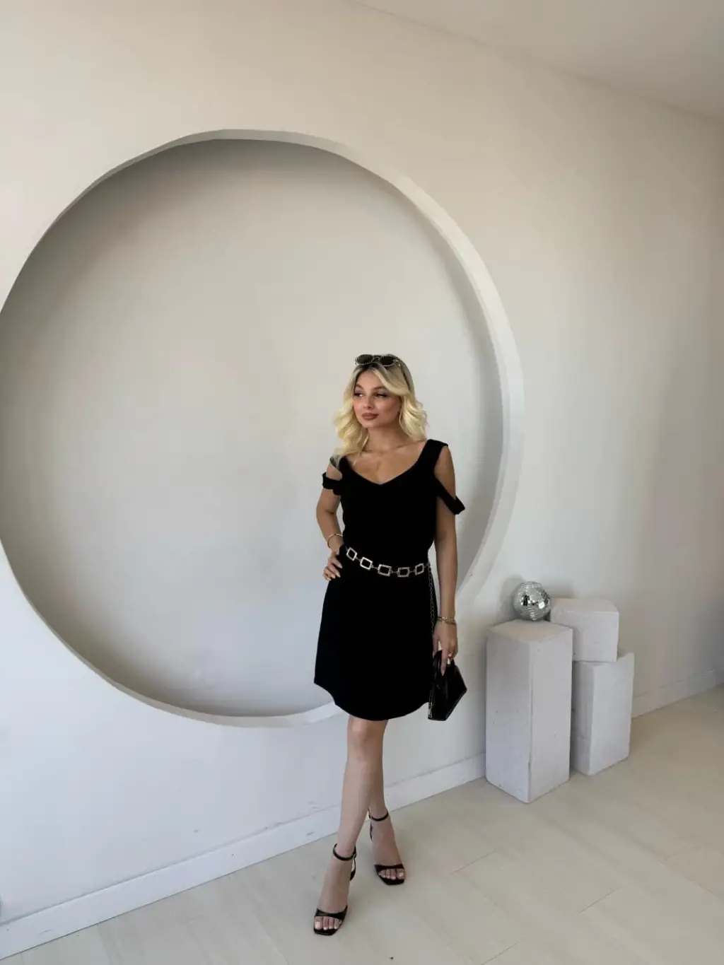 Kadın Uzun Kollu Zincirli Detay Parça Kesim Mini Elbise