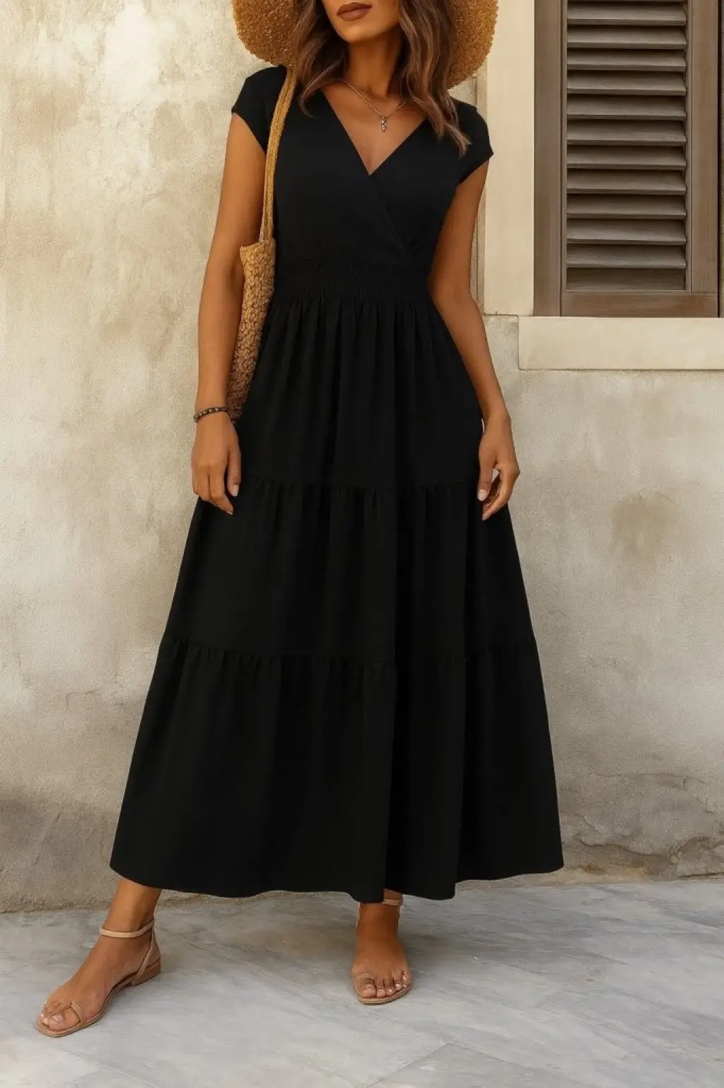 Kadın Kısa Kollu Kruvaze Yaka Beli Lastikli Süprem Maksi Boy Elbise