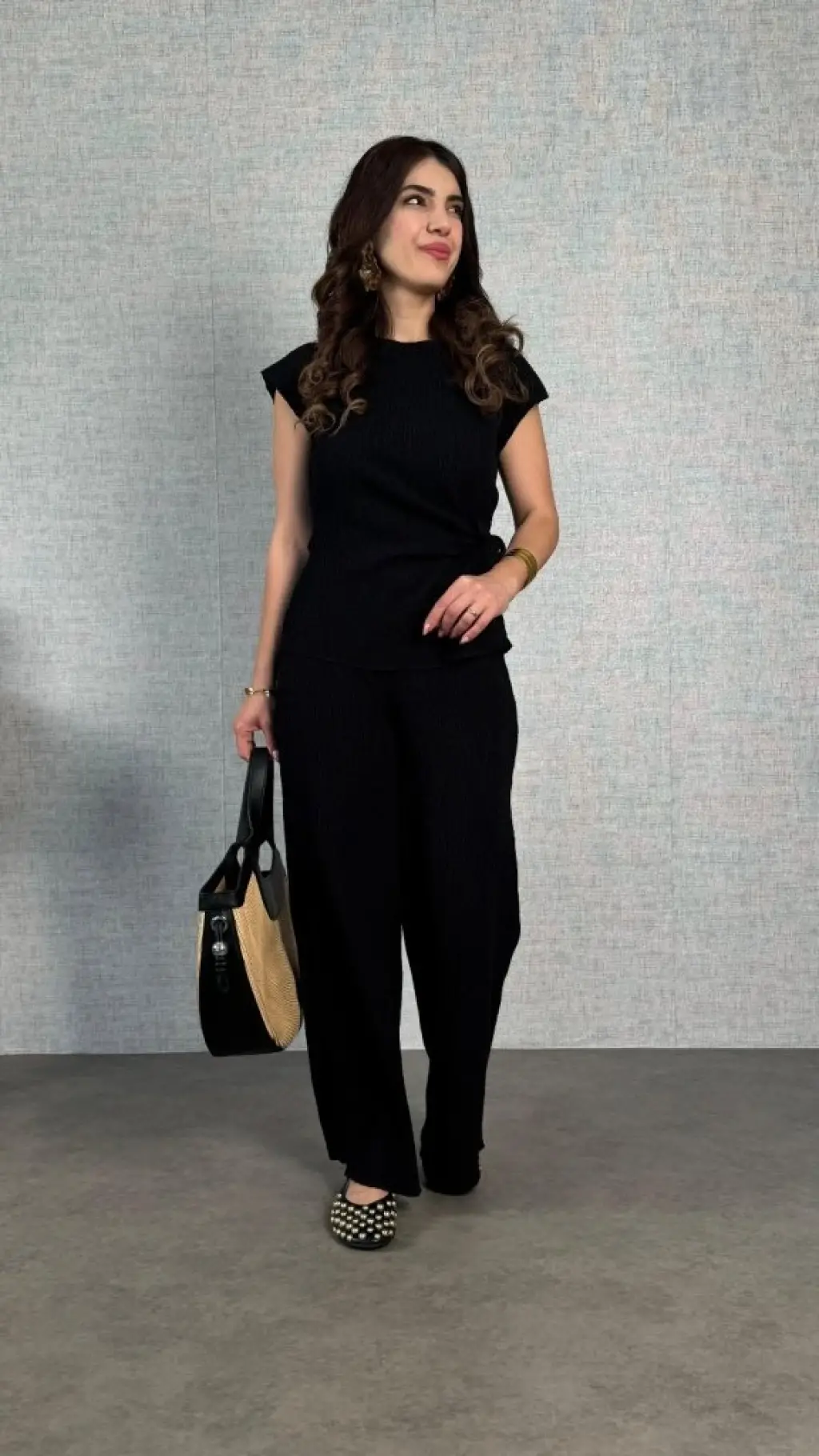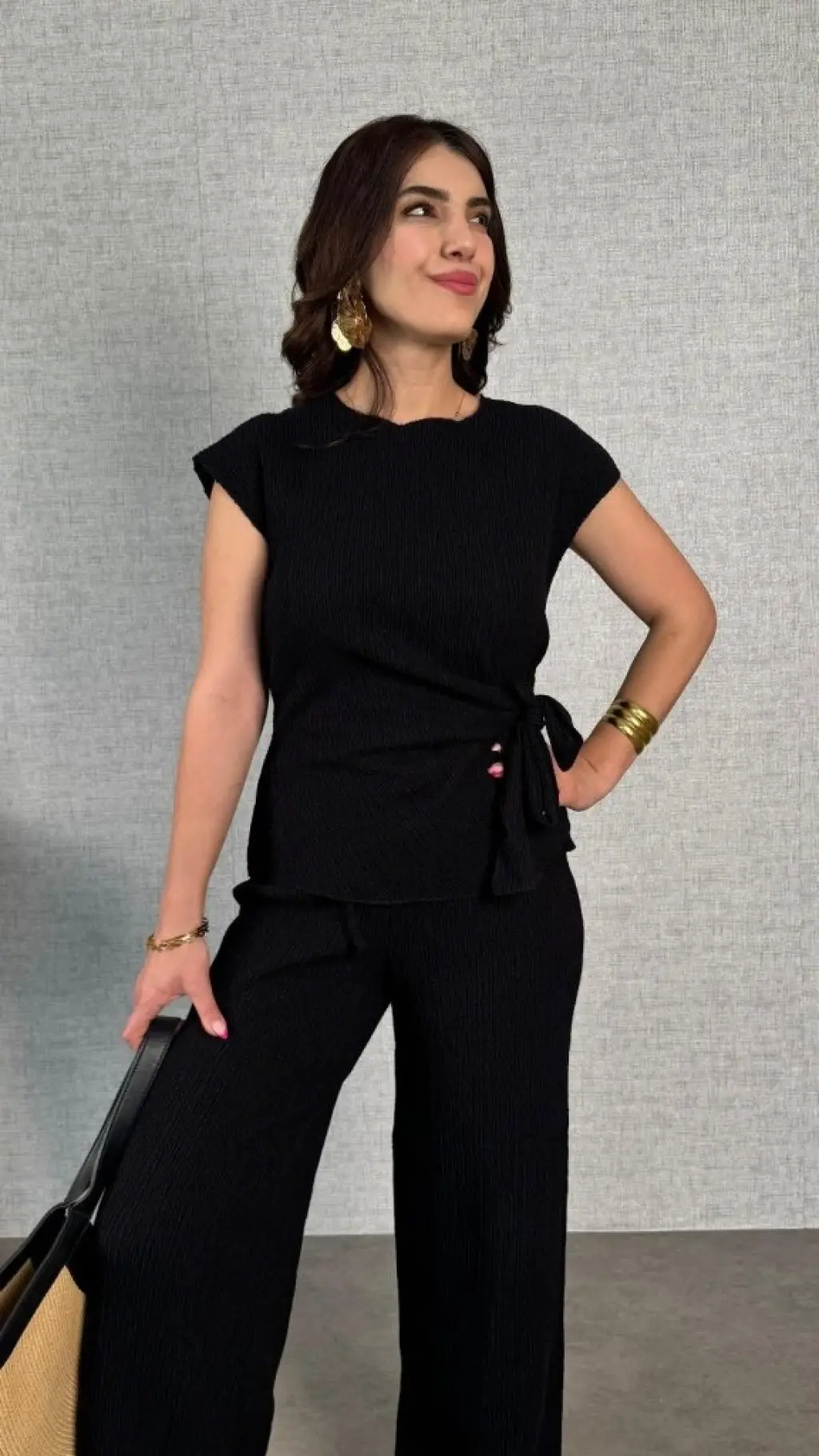 Kadın Kısa Kollu Bisiklet Yaka Yandan Bağlamalı Bürümcük Bluz Ve Pantolon Ikili Takım