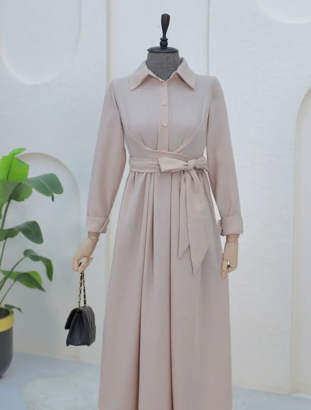 Yarım Düğmeli Önü Çapraz Bağlamalı Keten Elbise -Bej