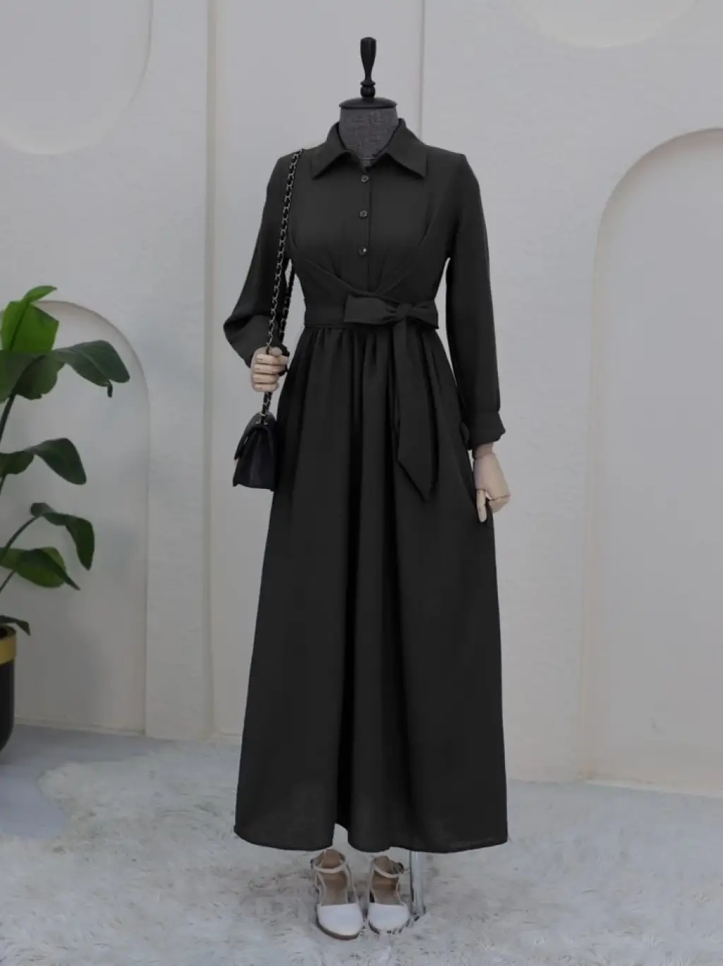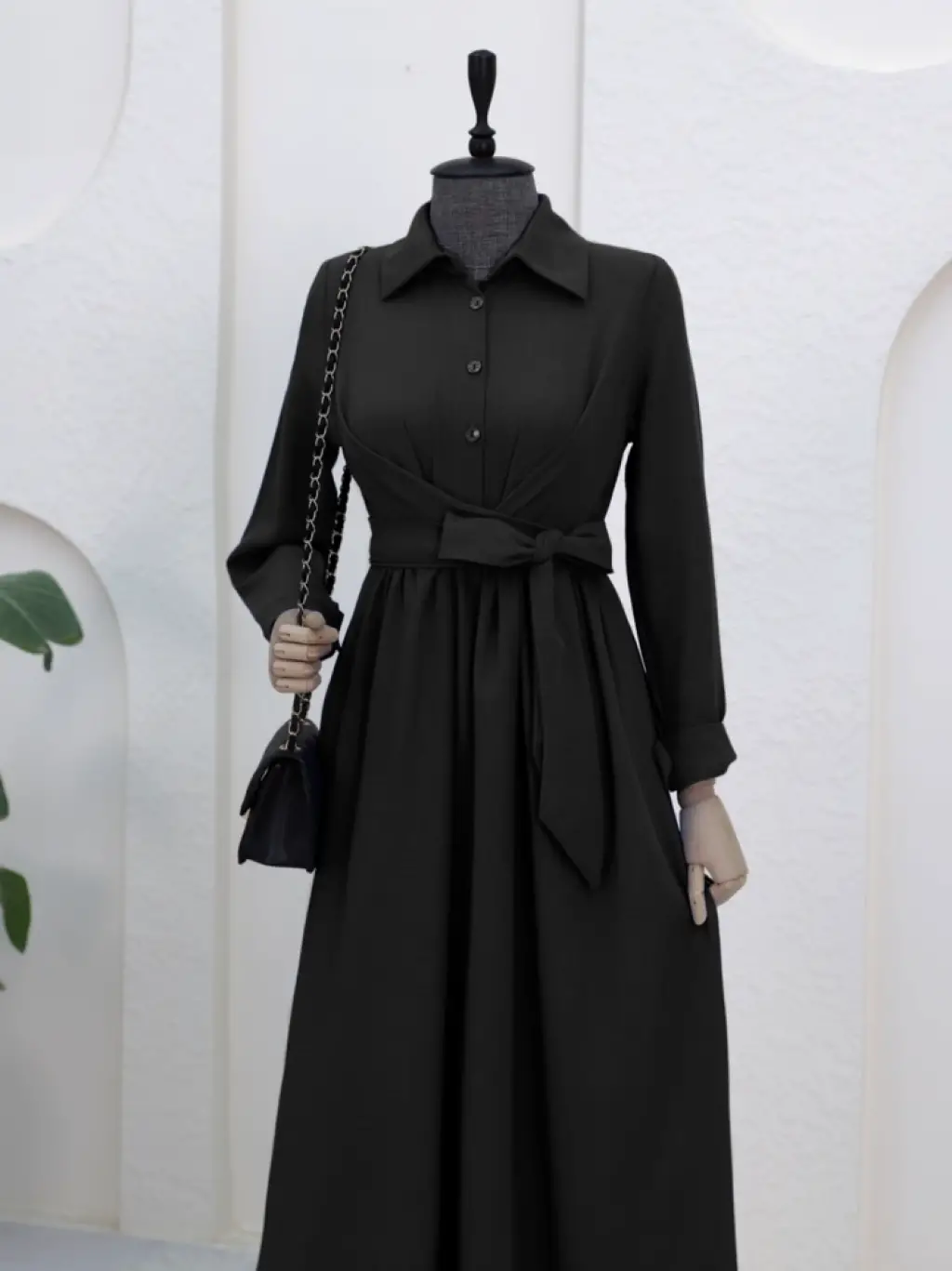 Yarım Düğmeli Önü Çapraz Bağlamalı Keten Elbise -Siyah