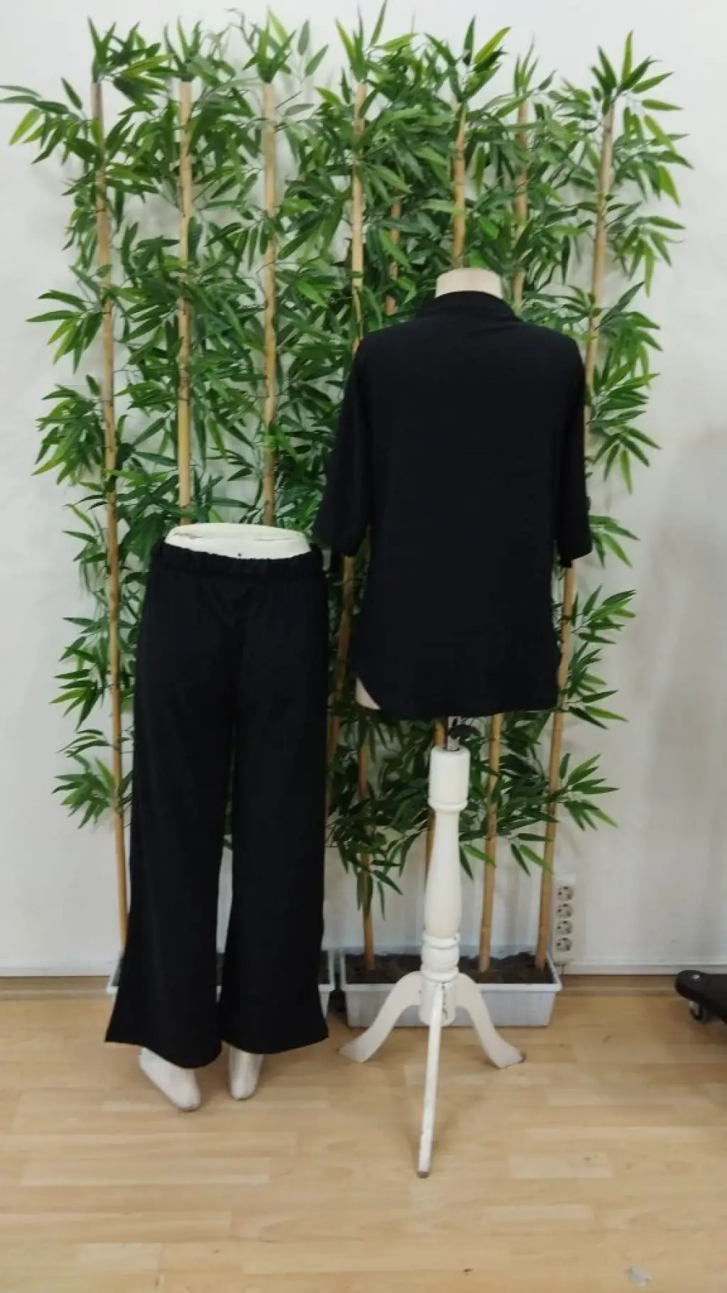 Kadın Kısa Kollu V Hakim Yaka Düğmeli Bürümcük Bluz Ve Pantolon Ikili Takım