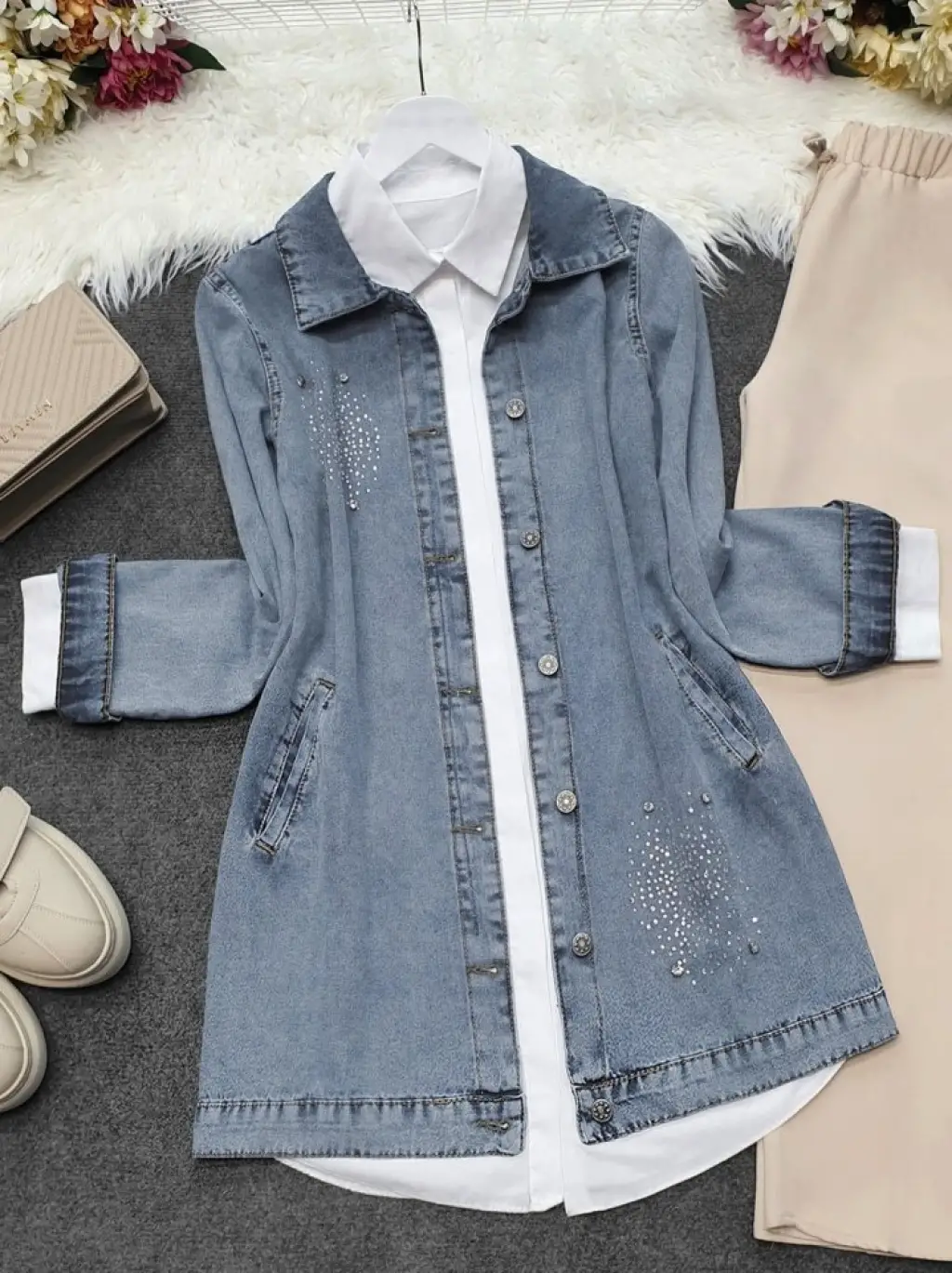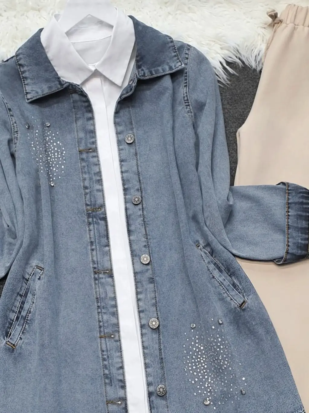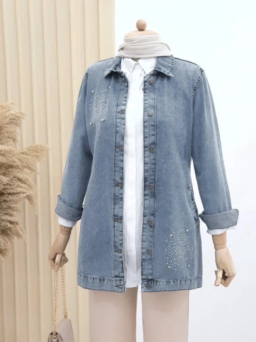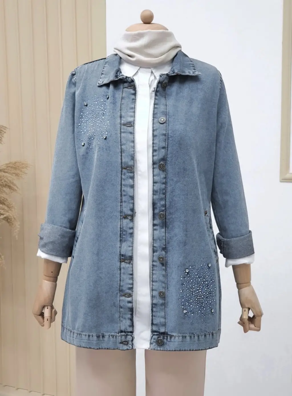 Önü Taş Detaylı Çift Cepli Kot Ceket -Buz Mavi