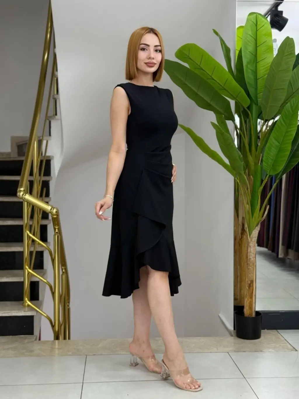 Kadın Sıfır Kollu Belden Büzgülü Eteği Volanlı Asimetrik Kesim Midi Janjan Krep Elbise