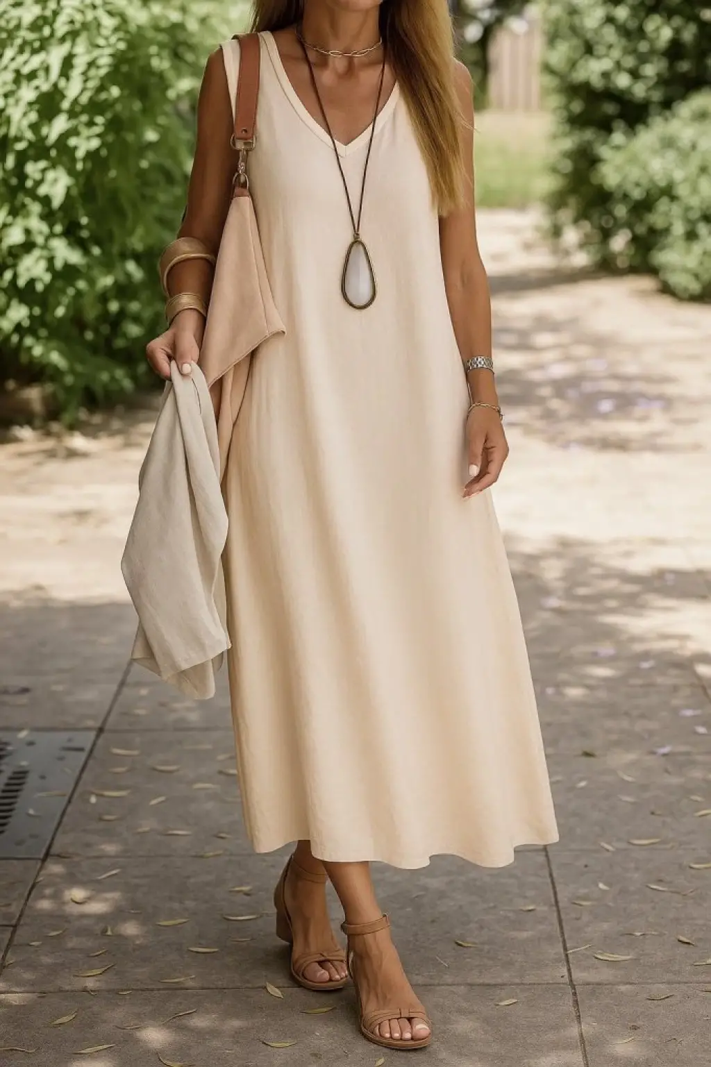 Kadın Kolsuz V Yakalı Maksi Boy Ithal Keten Elbise