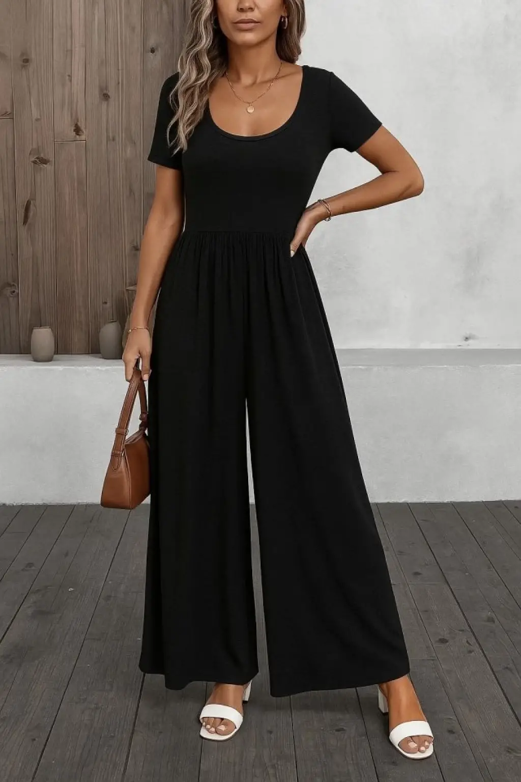 Kadın Kısa Kollu Yuvarlak Yaka Geniş Paçalı Bürümcük Tulum