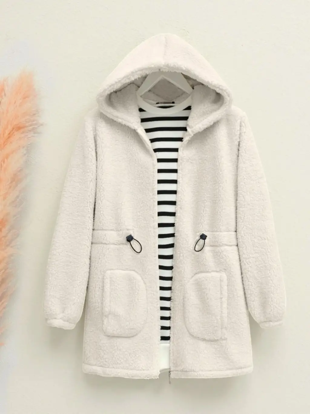 Beli Lastikli Kapşonlu Fermuarlı Peluş Mont -Ekru