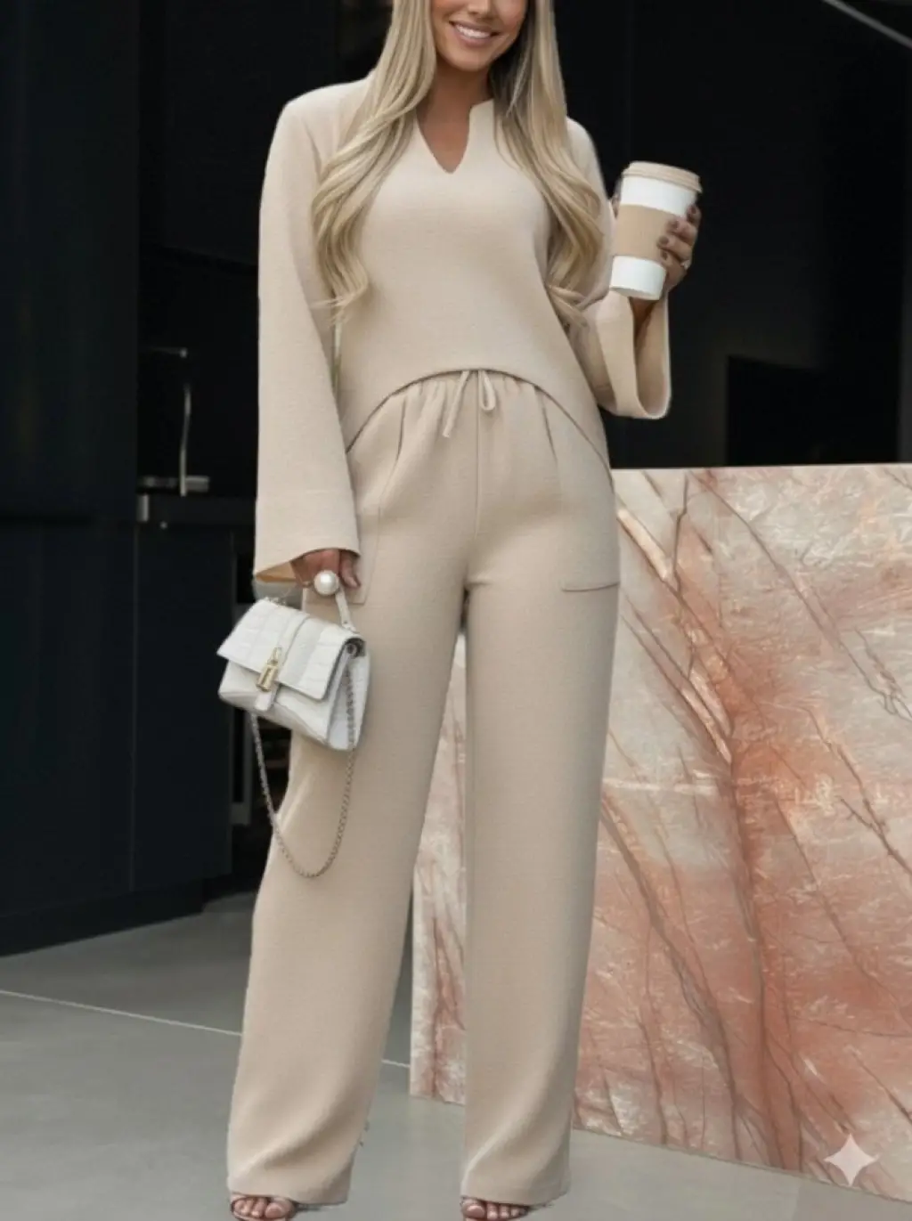 KETEN V YAKA BELDEN BAĞLAMALI BLUZ-PANTOLON TAKIM - Beyaz