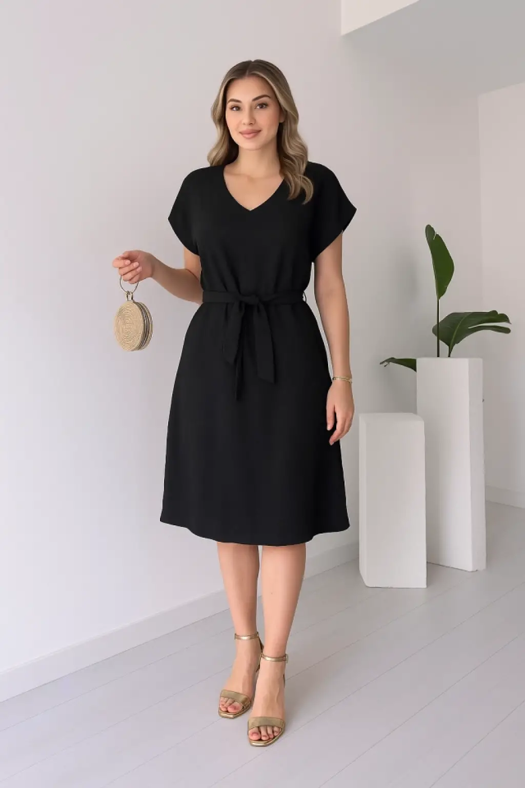 Kadın Kısa Kollu V Yakalı Beli Kuşaklı Ithal Keten Elbise