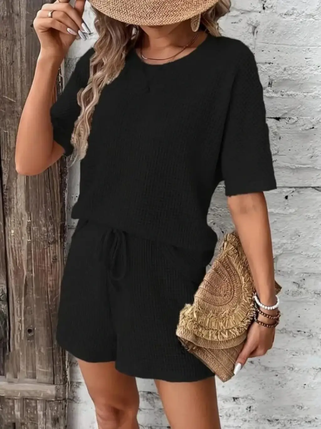 Kadın Kısa Kollu Bisiklet Yaka Alt Ve üst Waffle Ikili Takım