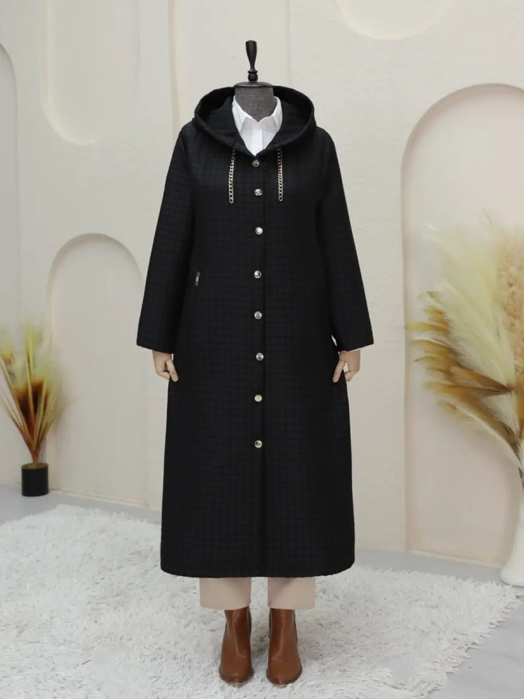 Sabit Kapşonlu Kuş Gözü Detaylı Uzun Kaban -Siyah