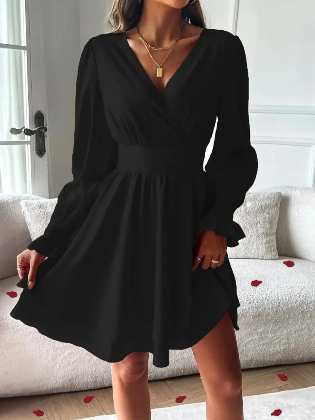 Kadın Uzun Kollu Kruvaze Yakalı Mini Sandy Elbise