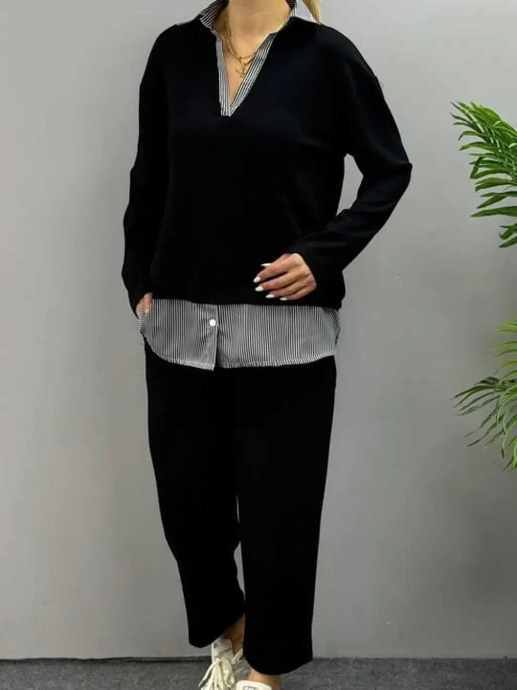 Kadın Uzun Kollu Balıkçı Yaka şardonlu Bluz Ve Pantolon Ikili Takım