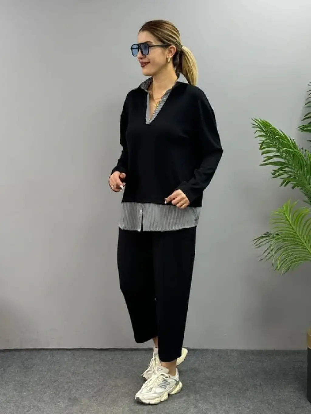 Polo Yaka Gömlek Detay Salaş Balon Pantolunlu ıkılı Takım