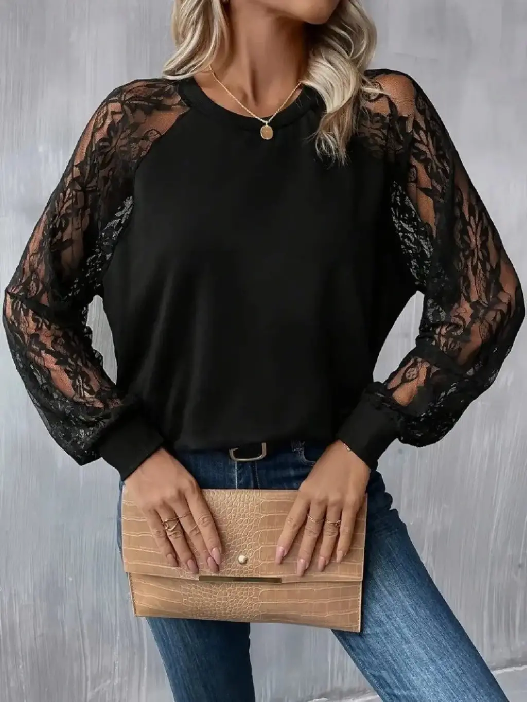Kadın Uzun Dantel Kollu Bisiklet Yaka Viskon Bluz