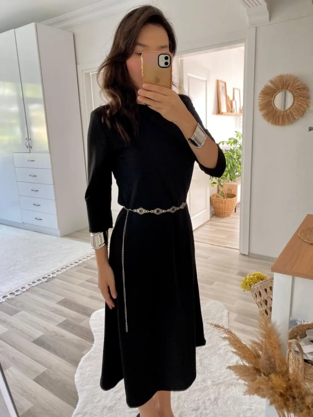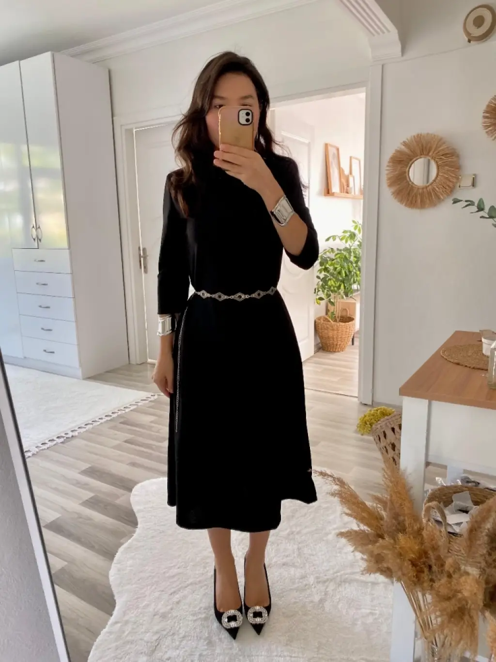 Kadın Uzun Truvakar Kol Bisiklet Yaka Midi Modal Elbise