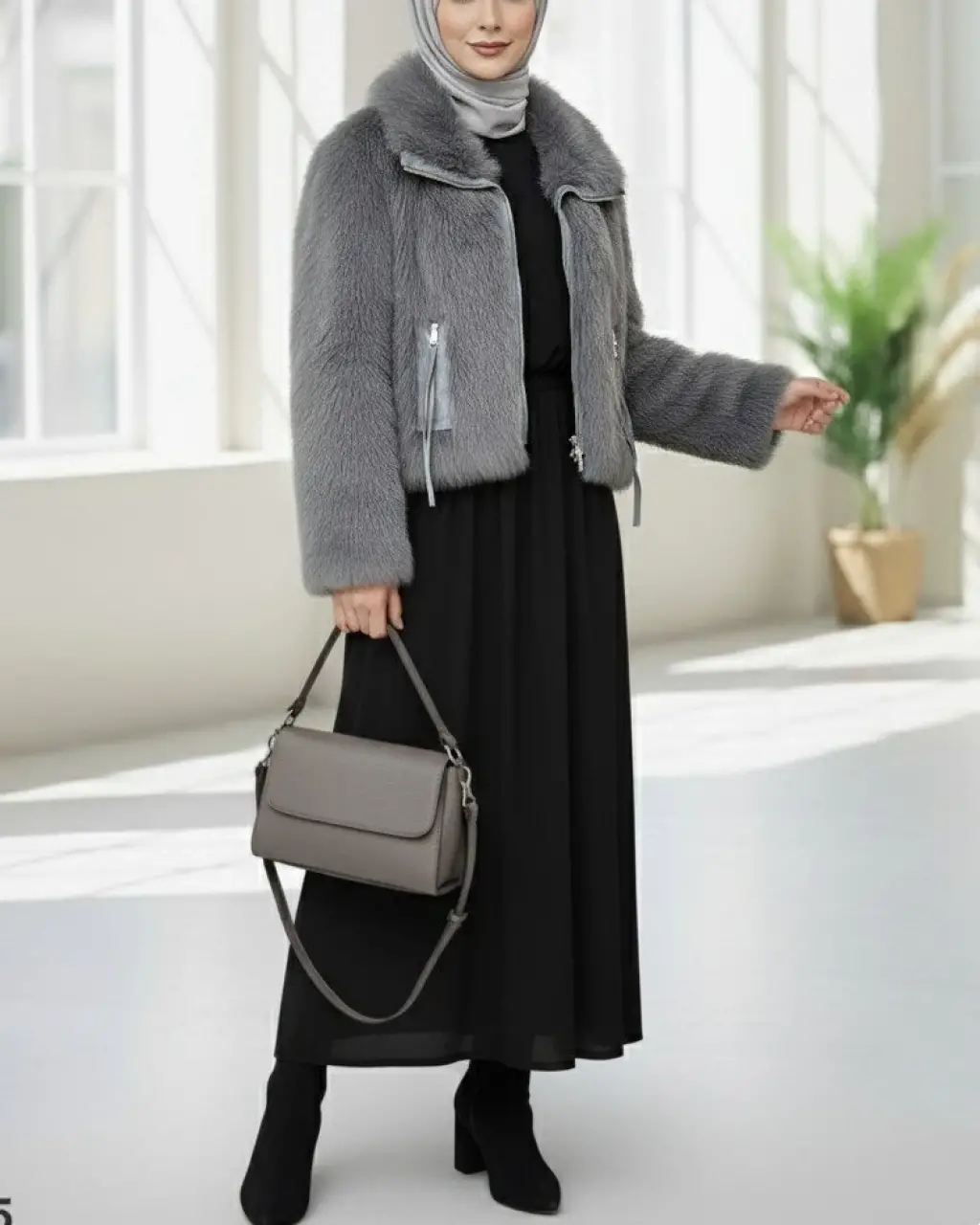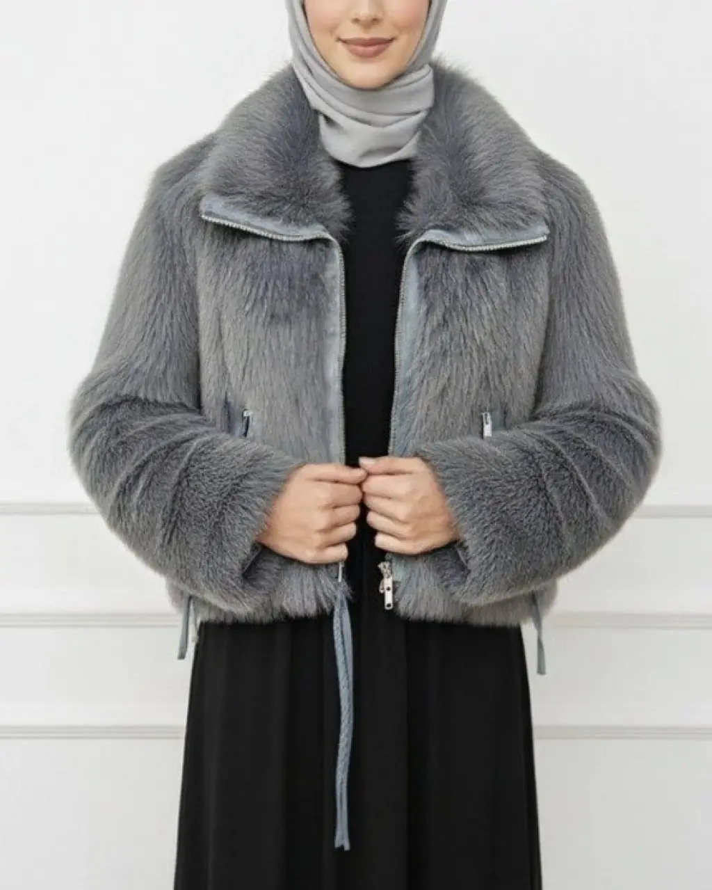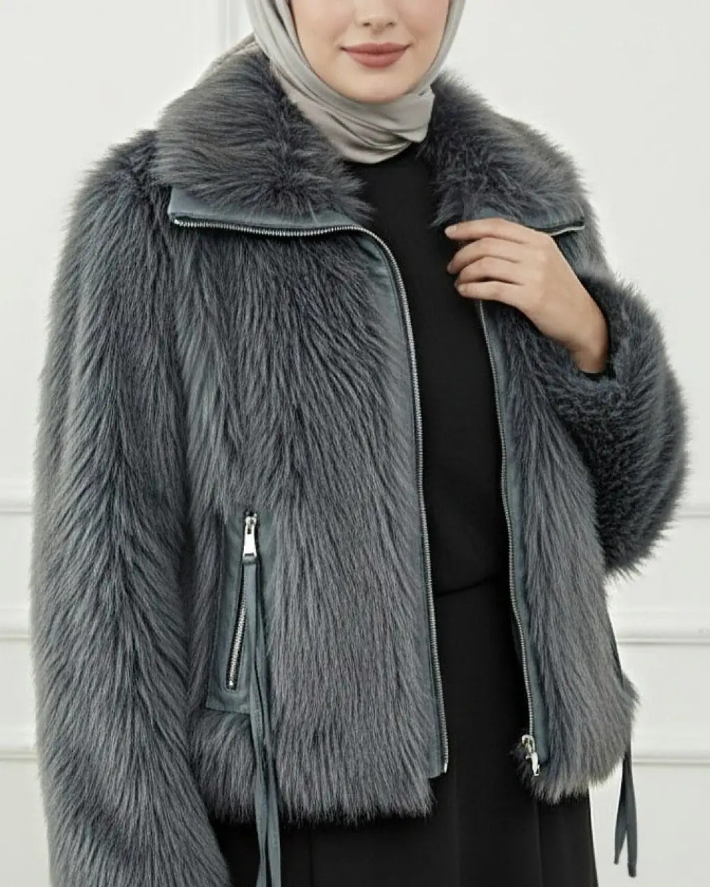 Deri Garnili İçi Astarlı Fermuarlı İp Detaylı Kürk Mont -Füme