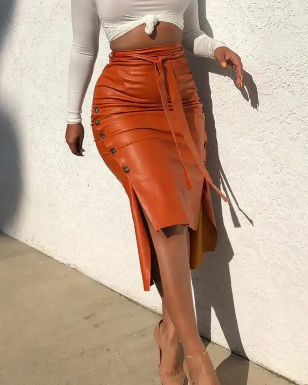 Kadın Yüksek Bel Uzun Yırtmaçlı Deri Etek