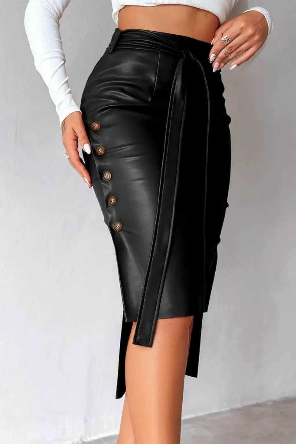 Kadın Yüksek Bel Kuşaklı Yanlardan Düğmeli Mini Deri Etek