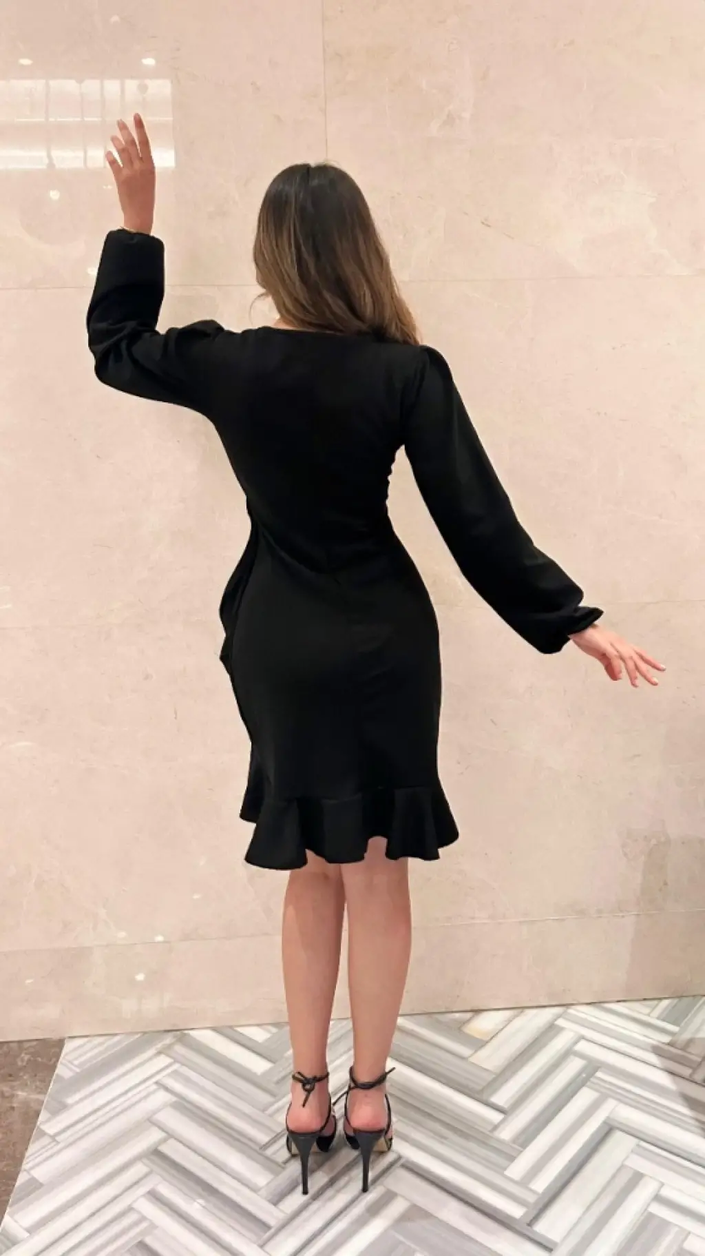 Kadın Uzun Kollu Bisiklet Yaka önden Volanlı Ithal Krep Elbise