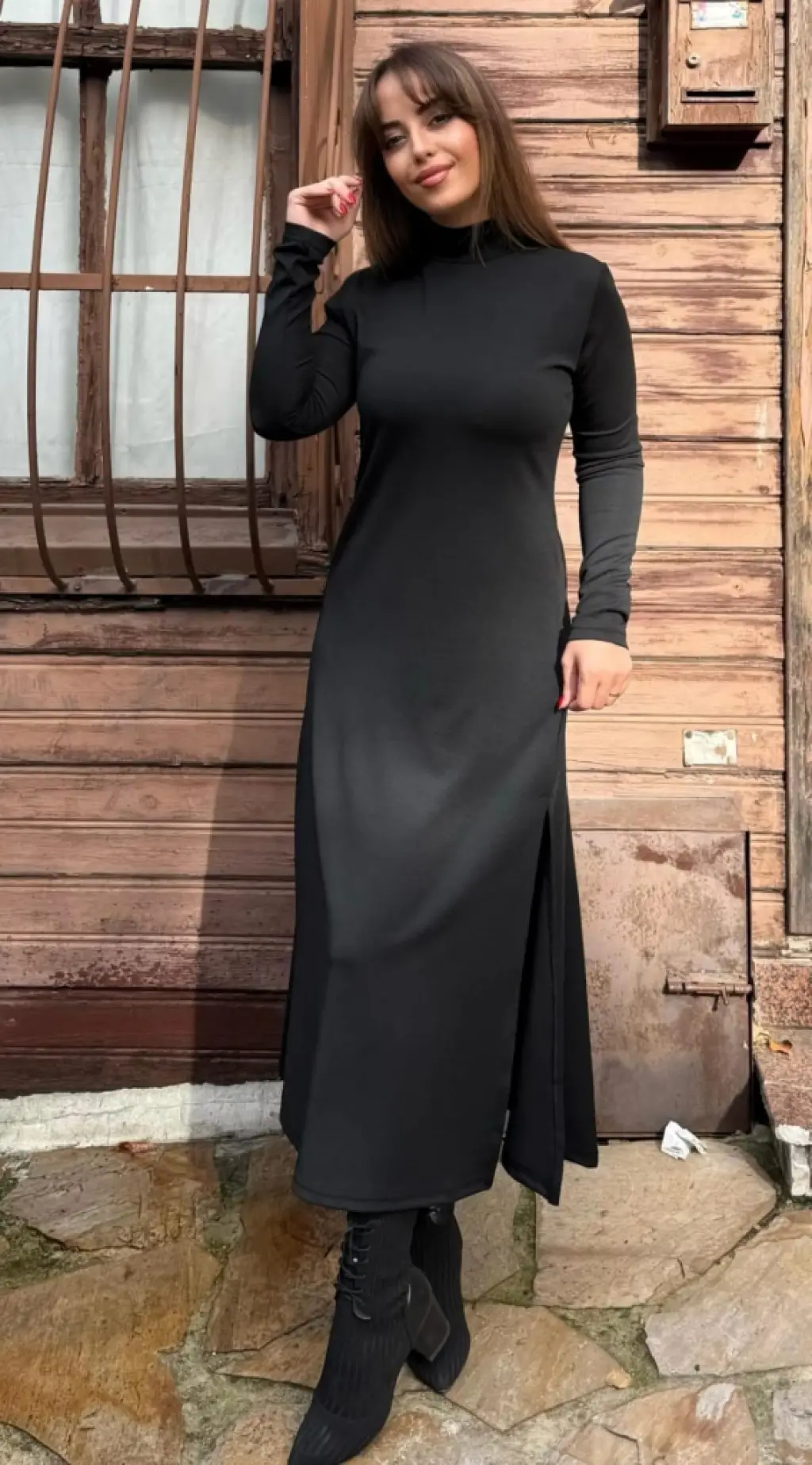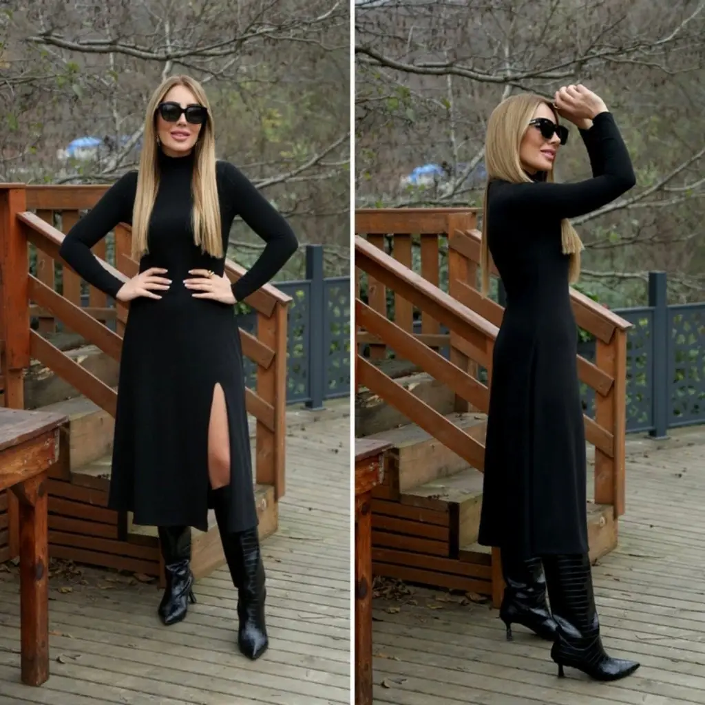 Kadın Uzun Kollu Balıkçı Yaka Derin Yırtmaç Detay Krep Elbise