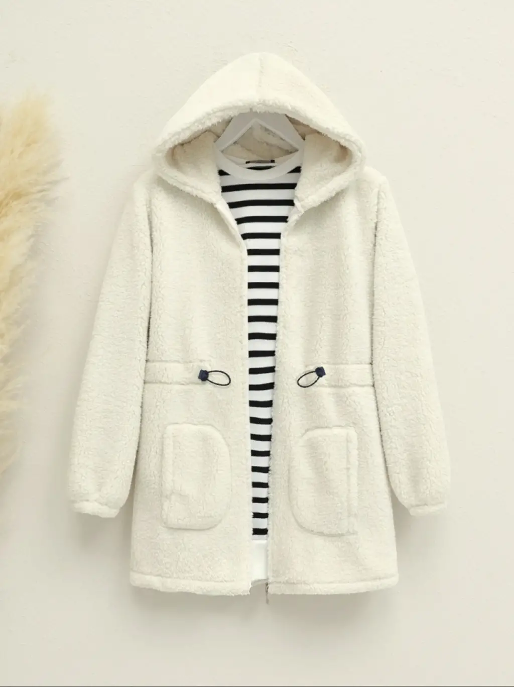 Beli Lastikli Kapşonlu Fermuarlı Peluş Mont -Ekru