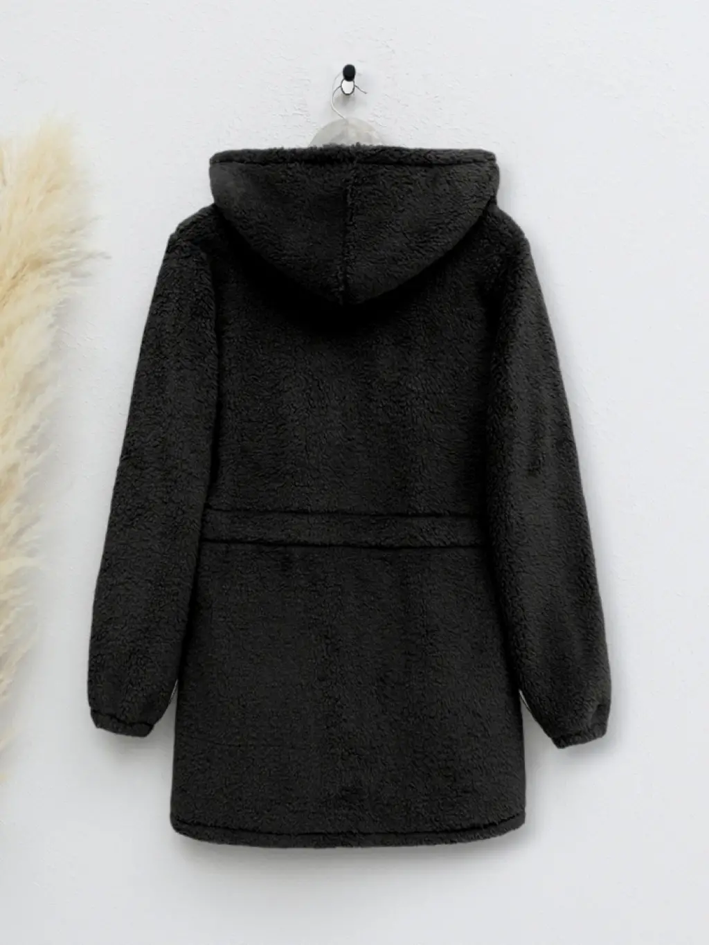 Kapşonlu Önü Düğmeli Astarlı Peluş Kaban -Siyah