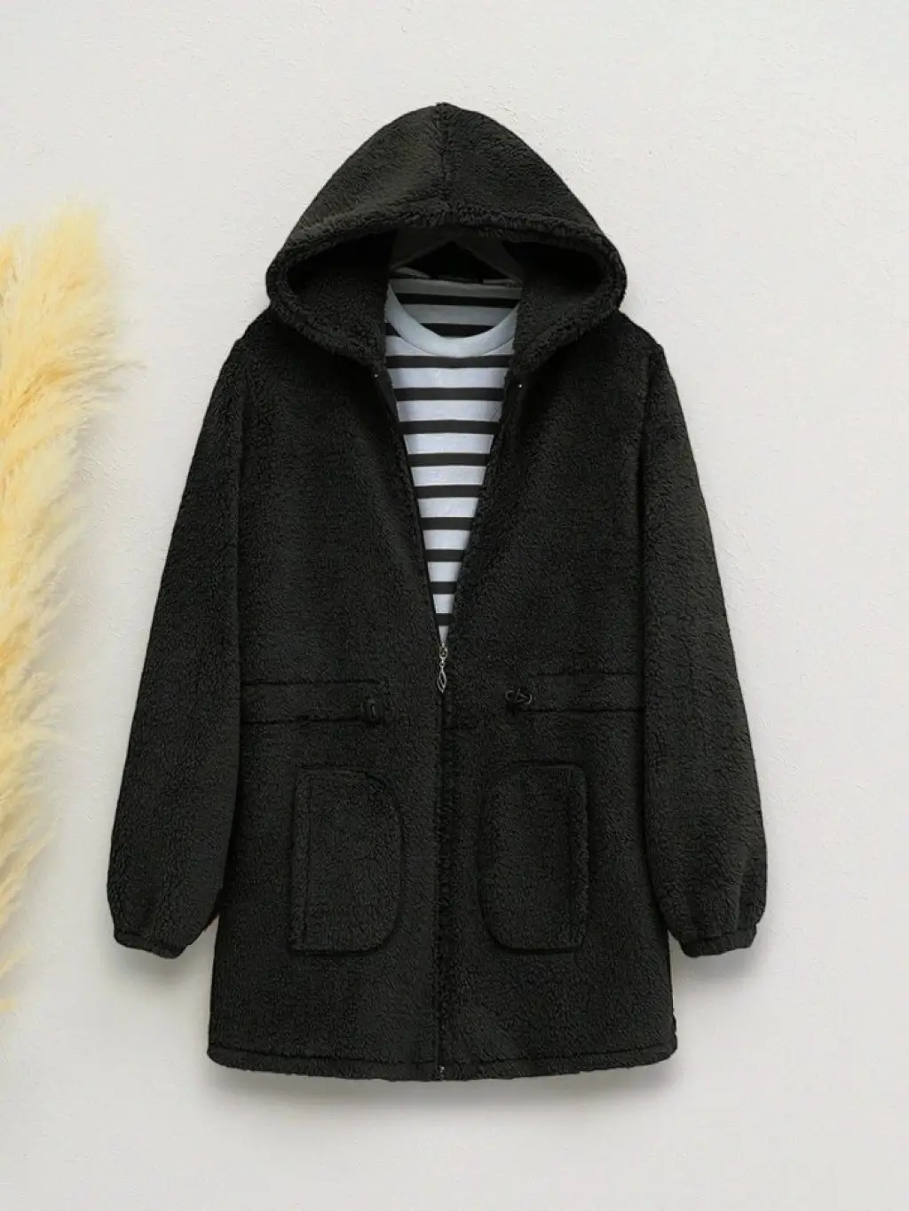 Beli Lastikli Kapşonlu Fermuarlı Peluş Mont -Siyah
