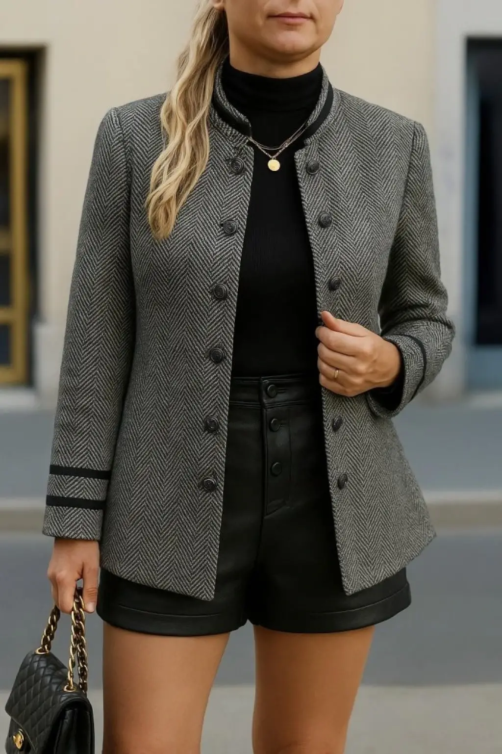 Kadın Uzun Kollu Hakim Yaka Düğme Detaylı Mini Dokuma Ceket