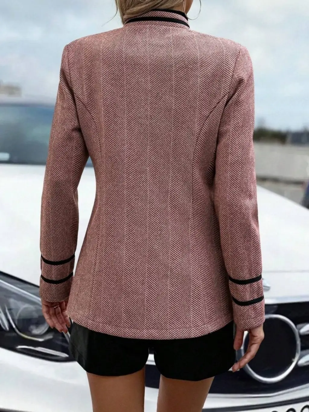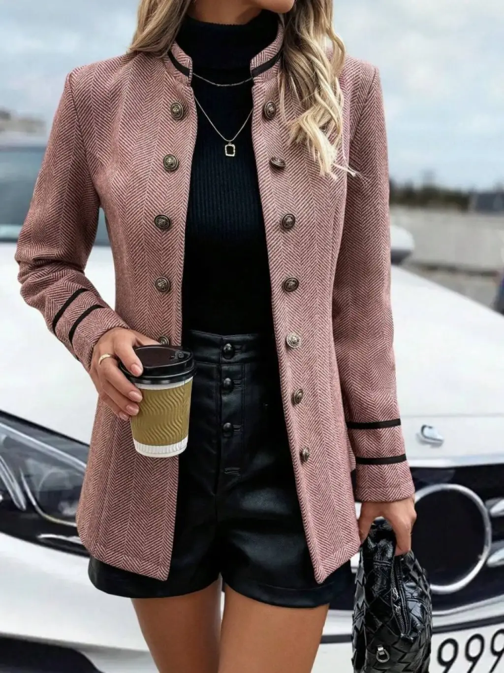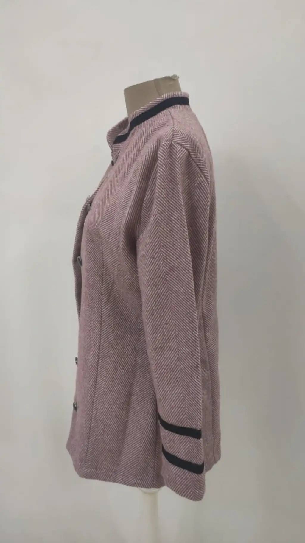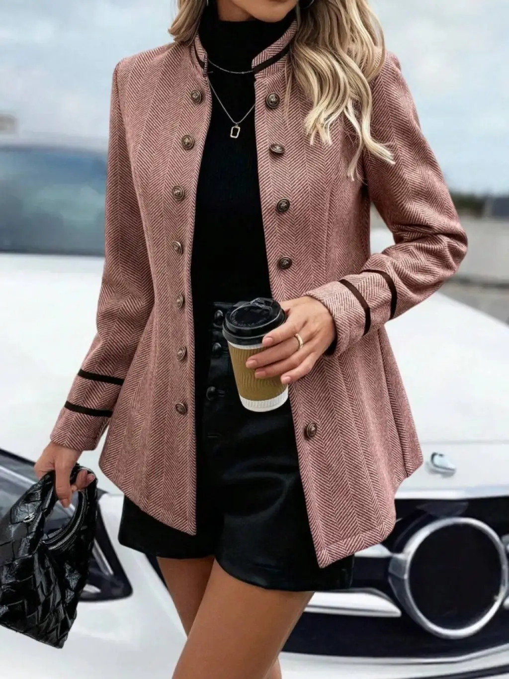 Kadın Uzun Kollu Hakim Yaka Düğme Detaylı Mini Dokuma Ceket