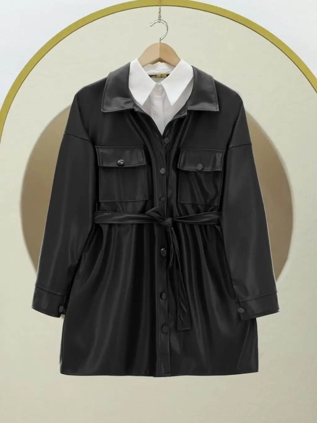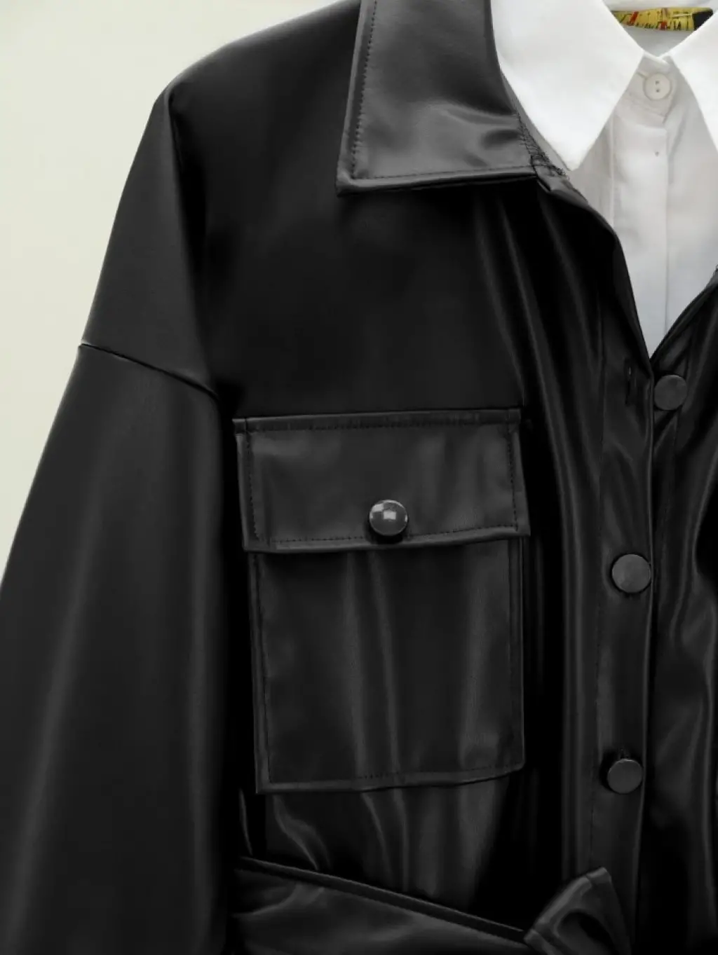Beli Bağlamalı Çift Cepli Deri Gömlek -Siyah