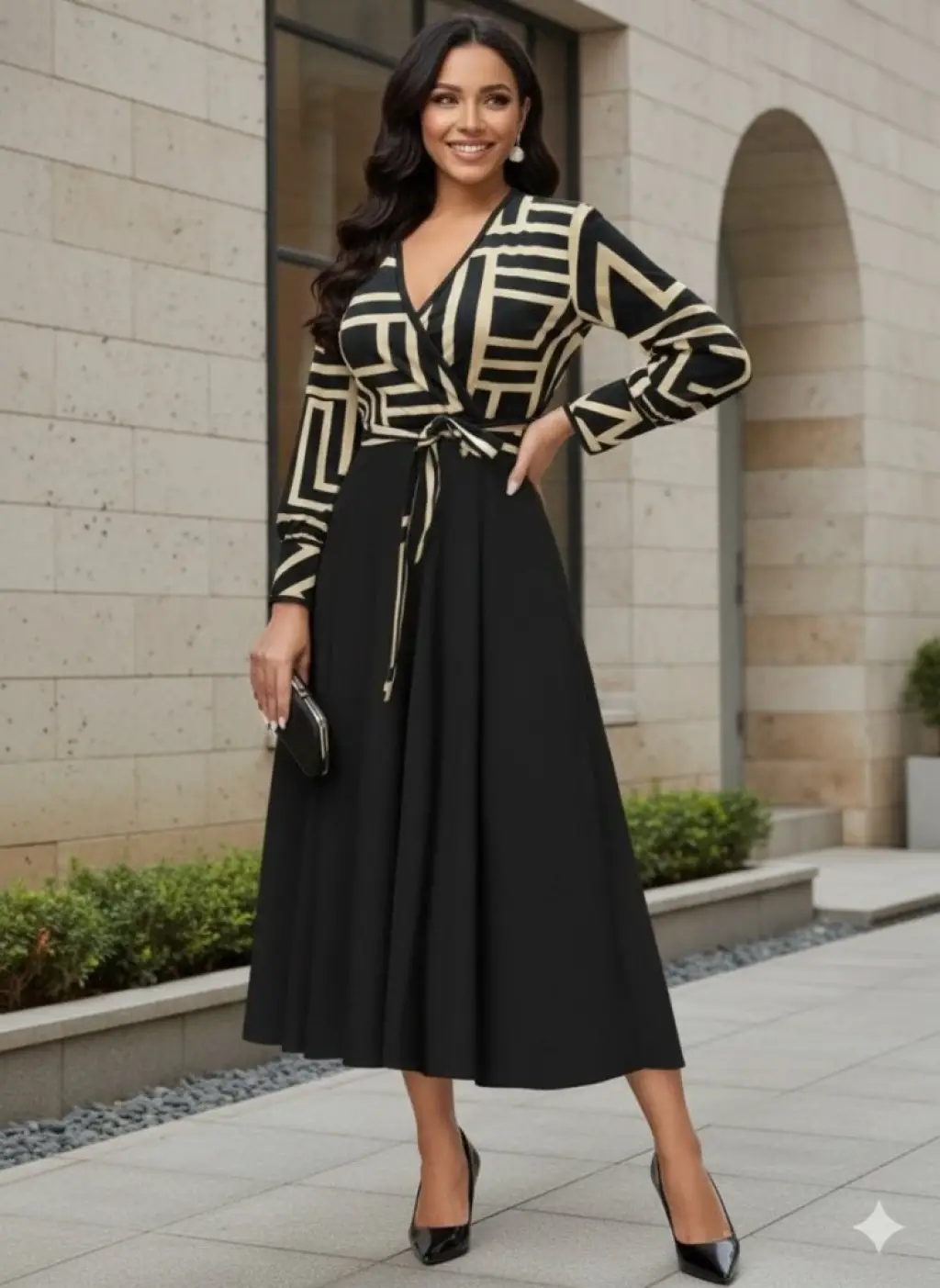 Kadın Uzun Kollu Kruvaze Yaka Dalgıç Krep Midi Boy Elbise