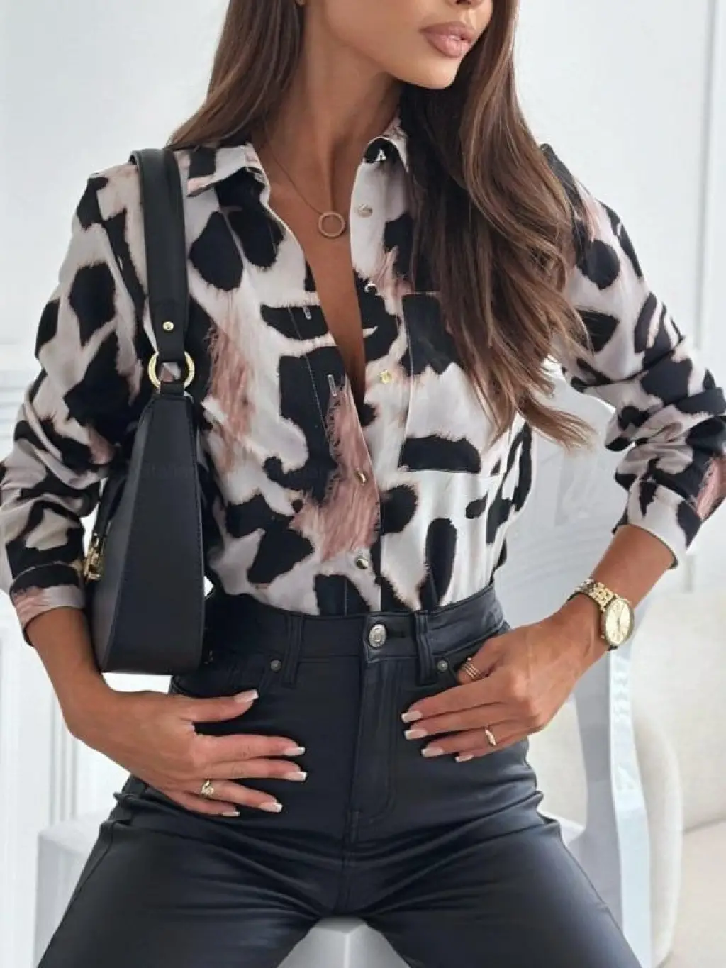 Kadın Uzun Kol Cep Detay Leopar Baskılı Mosskrep Kumaş Gömlek