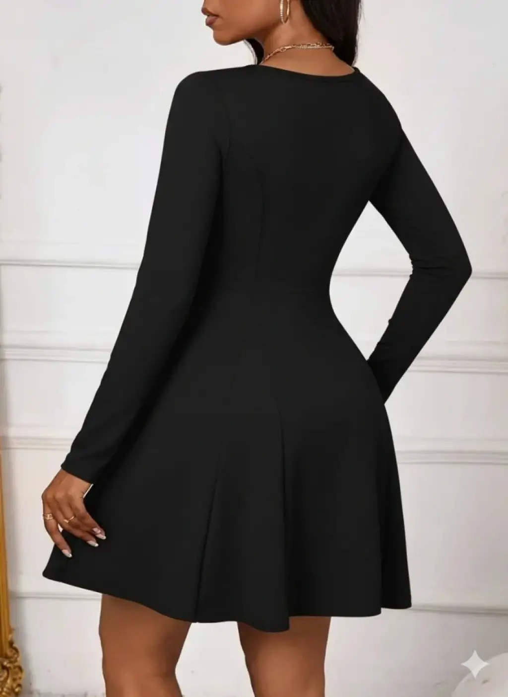 Kadın Uzun Kollu Kare Yakalı Mini Ithal Krep Elbise