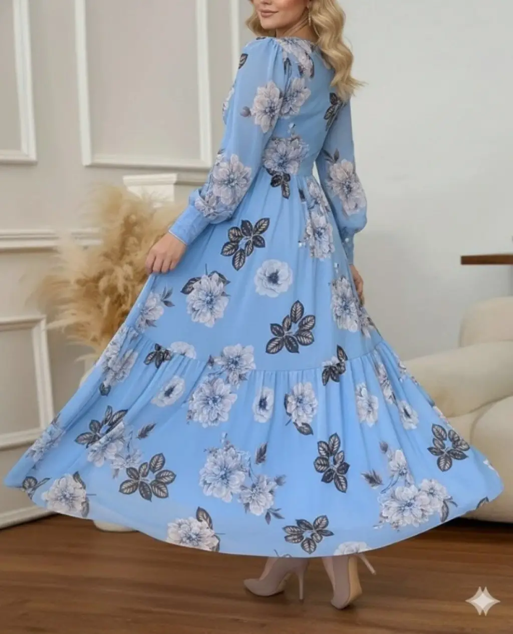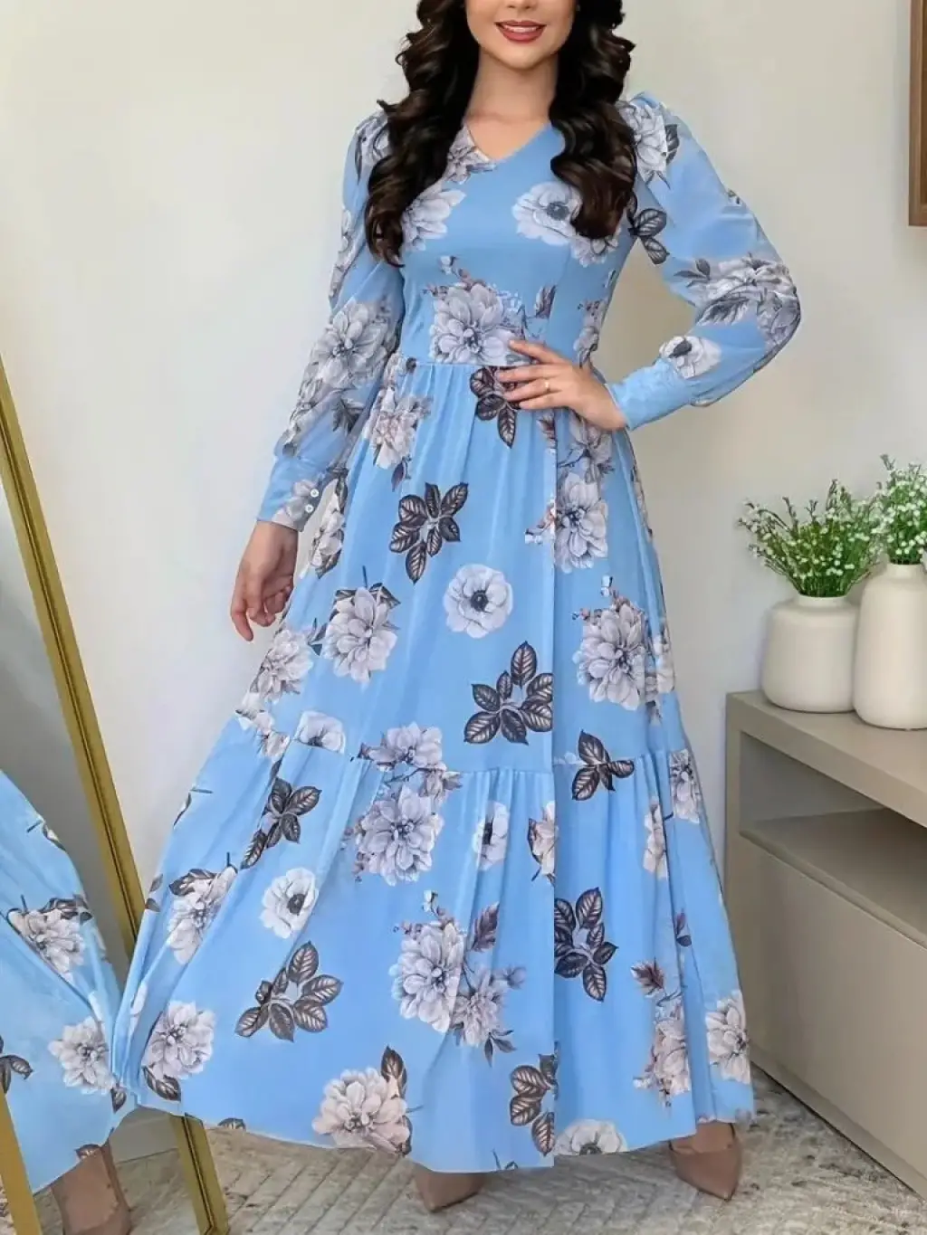 Kadın Uzun Kollu V Yakalı çiçek Desenli Maxi Süprem Elbise