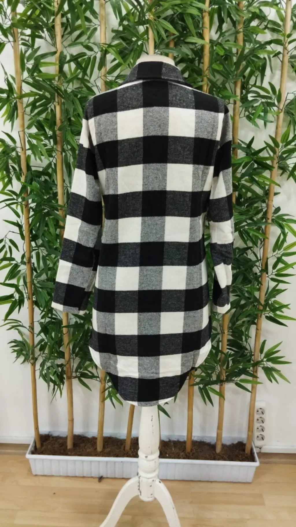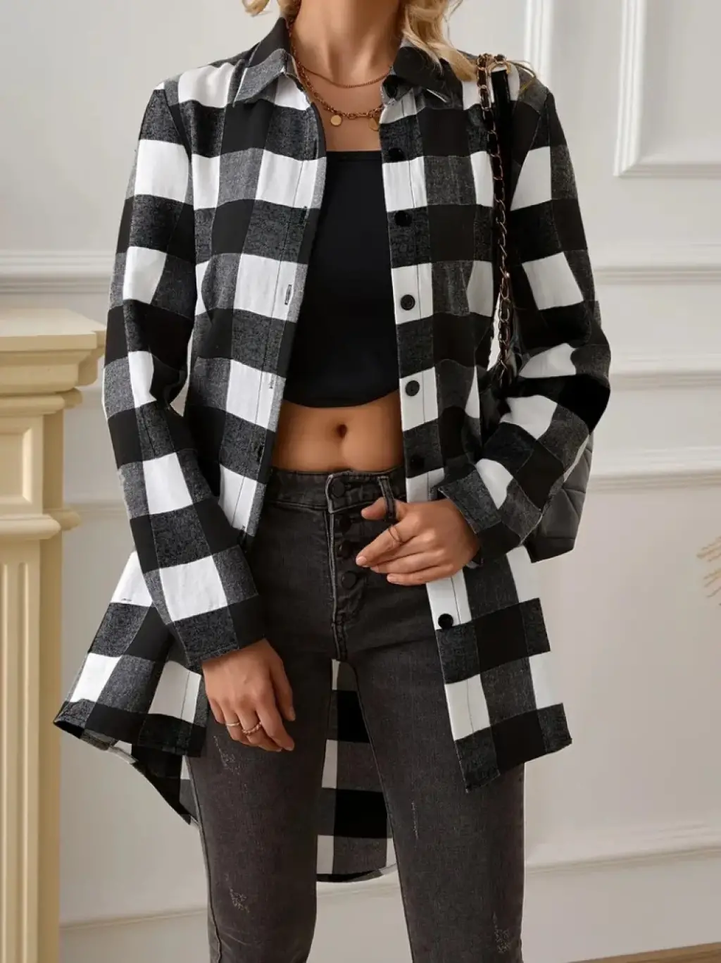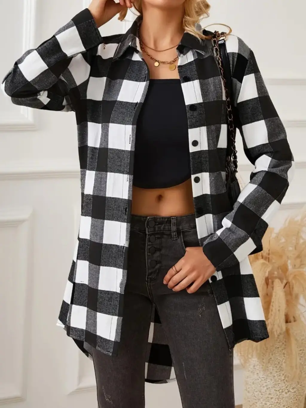 Kadın Uzun Kollu Ekoseli önden Düğmeli Dokuma Uzun Gömlek
